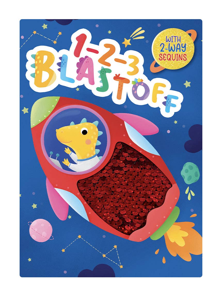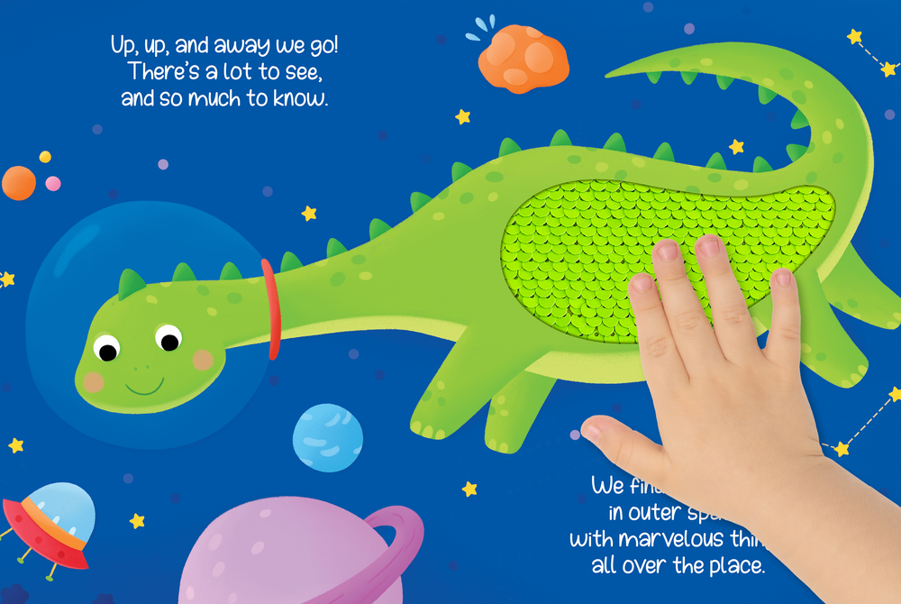 1-2-3 Blastoff! Let’s explore outer space with these dinosaur astronauts. See the moon, planets, and even a shooting star. Kids touch and feel their way through the book as they interact with the two-way sequins and learn fun facts about things in space.