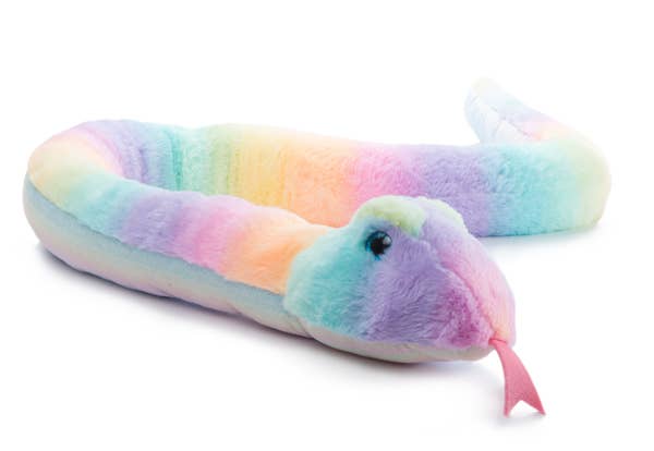 Slither into fun-filled adventures with this snake plush toy a bulging pink tongue, a curved tail and a multi-colored rainbow body.