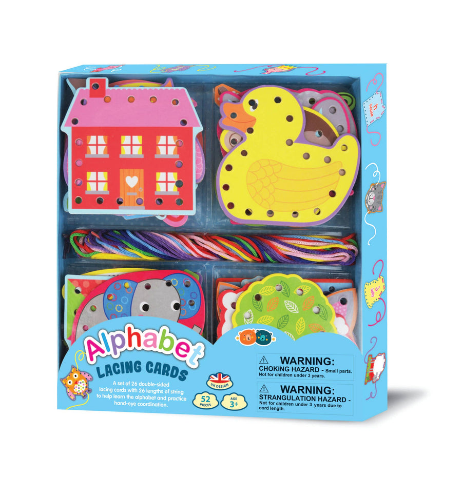 Kids love to thread the string through these lacing cards, helping to learn the alphabet and develop fine motor skills. This boxed set contains large shaped cards with the picture on one side and the letter and word on the other. Includes 26 cards and 26 brightly coloured strings. All packed in a flat box with lift-off lid.