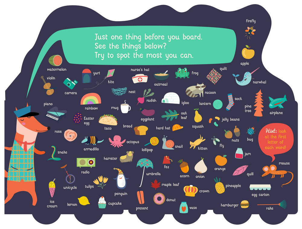 All aboard the Alphatrain. This adorable two-in-one board book features beautifully illustrated animals for every letter of the alphabet and can be read page-by-page as a lap book or be unfolded into a 42" train! (Perfect for play time or room decor!) In addition to the animals, each whimsically designed train car includes fun objects for each letter: Bear eats a banana, Elephant listens to earphones, and Fox wears a fez (of course).