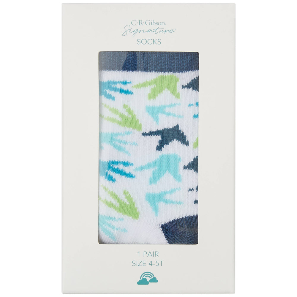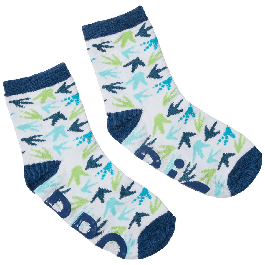Boxed socks in colorful patterns each sporting anti-slip printing on the bottom.