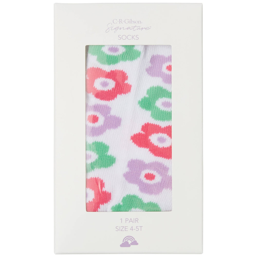 Boxed socks in colorful patterns each sporting anti-slip printing on the bottom.