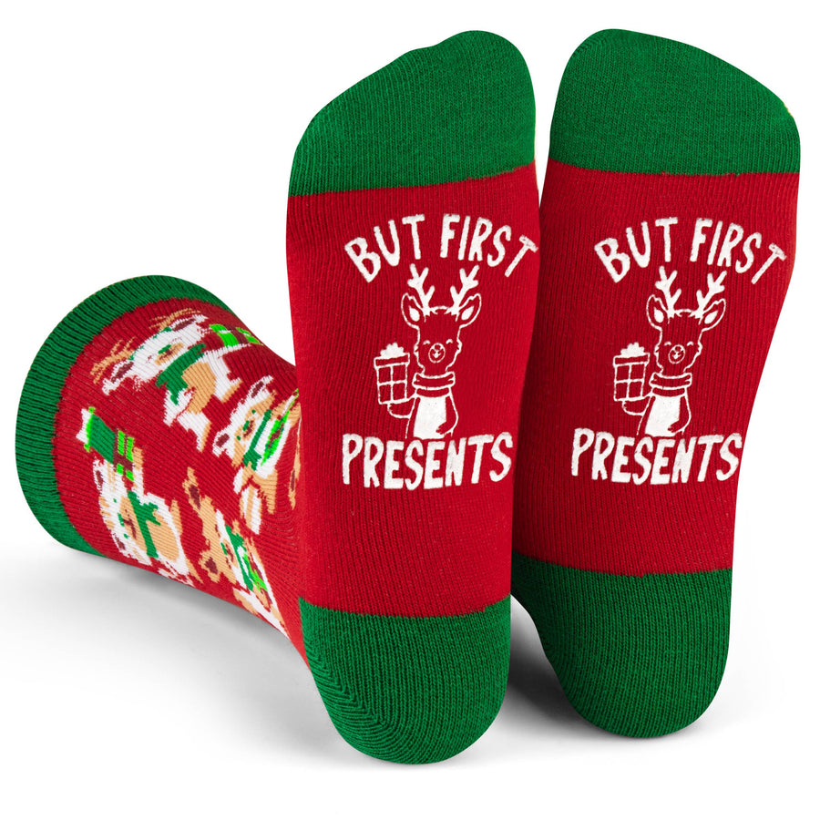 Make their Christmas morning even more special with these 'But First, Presents' socks. These fun and festive Christmas socks for kids are the perfect gift to spread holiday cheer! The design features a colorful array of presents, plus a funny message on the bottom that will make em' laugh. Give your little ones something special to unwrap this year with a stocking stuffer they won't soon forget!