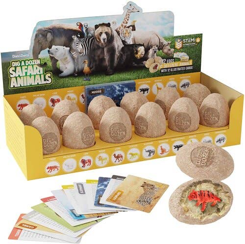 Dig up 12 animal eggs, and discover 12 unique animal models. Displayed in a sleek box.