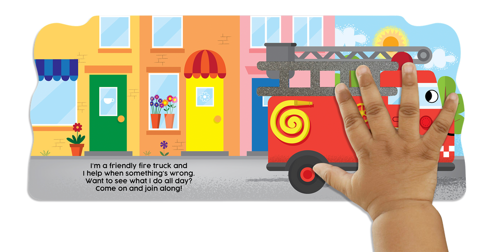 Ride around the neighborhood with this friendly fire truck and see all the things it can do! Kids touch and feel their way to learning about a day in the life of this rescue vehicle. Rhyming text and fun illustrations are complemented by various touch and feel elements, allowing children to stimulate their sense of touch. And, the sturdy board book is shaped, making it fun for children to pretend to drive the fire truck around town after they’re done reading.