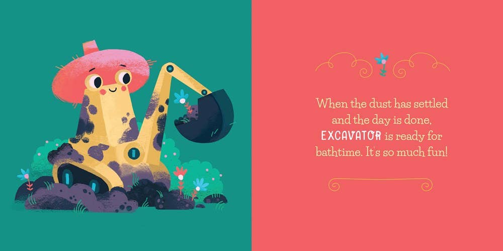 Trucks dig bathtime. Join Excavator and the other construction trucks as they scrub-a-dub-dub away the dust of the day with a well-earned bath. Adorable yet accurate illustrations will have kids peeking through the bubbles to identify Crane, Backhoe, Bulldozer, and more! You'll dig bathtime too.