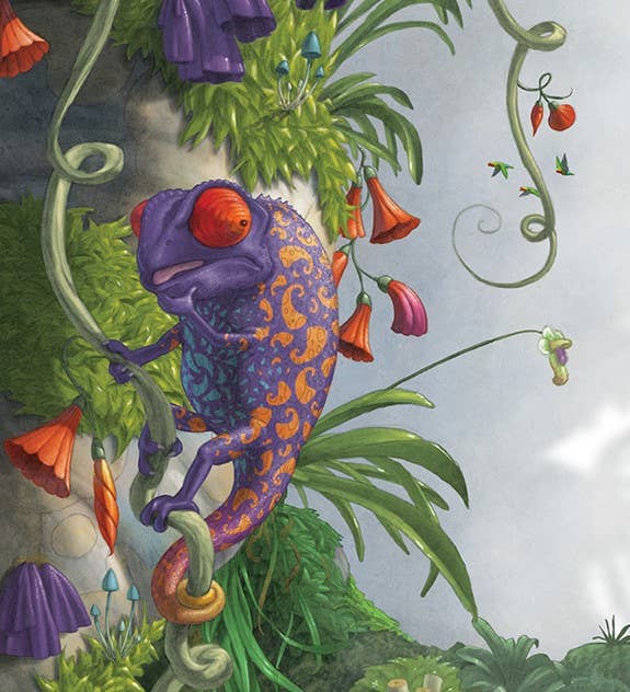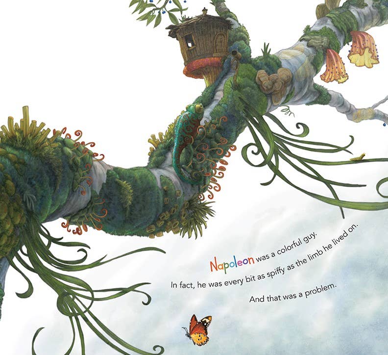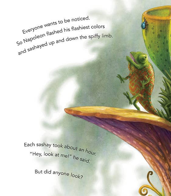 In this beautifully illustrated, hardcover picture book, we meet Napoleon. Napoleon has no friends since as a chameleon he blends into the environment and no one can see him. But Napoleon has some tricks to try to get noticed. Will has flashy colors and funny faces work? A little bit of where's Waldo and a bit of a lesson for little ones on what kinds of things they might to do get attention, Invisible Lizard is sure to please!