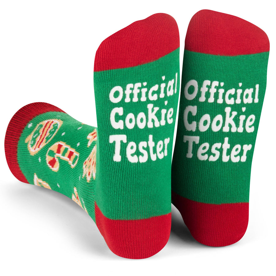 What kid doesn't love holiday cookies and being the first to taste them! Bake their day with a pair of these funny socks that proudly pronounce they are the "Official Cookie Tester"! The design features an assortment of tasty holiday cookies in festive Christmas colors that kids will love to show off.