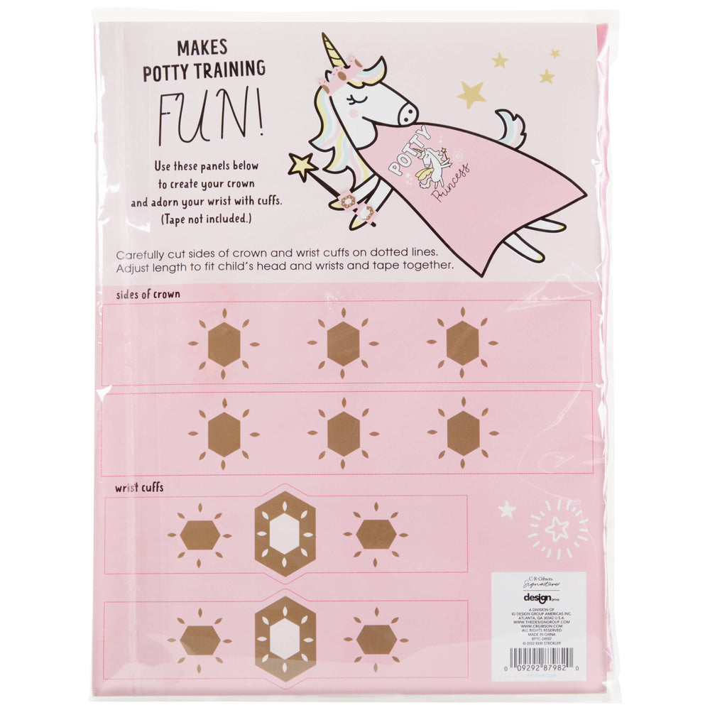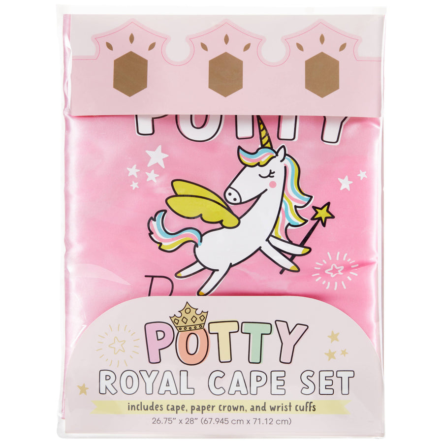 SUPER POTTY PRINCESS cape lined with Velcro neck closure. Design screen printed on the back of cape. 100% polyester. Machine washable. Bonus cut out paper crown & wrist cuffs. Measures 19" l with 28" sweep