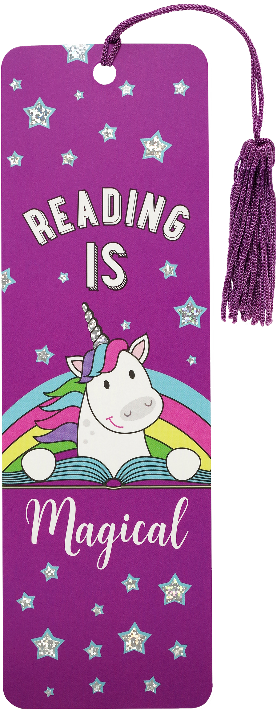 ''Reading Is Magical.'' Encourage young readers' imaginations with this charming bookmark. A unicorn looks up from its book, surrounded by a rainbow, stars, and the words, ''Reading Is Magical.'' Design is enhanced with eye-catching silver foil and holographic highlights. Attached: A pretty purple tassel. Bookmark is printed on sturdy, smooth-finish card stock. On the back: A handy little ruler in inches and centimeters, printed on a purple background. Bookmark is encased in a protective clear plastic sleeve. Bookmark measures 2-1/2'' wide x 7-1/8'' high. Warning: Choking hazard, small parts. Not for children under 3 years.