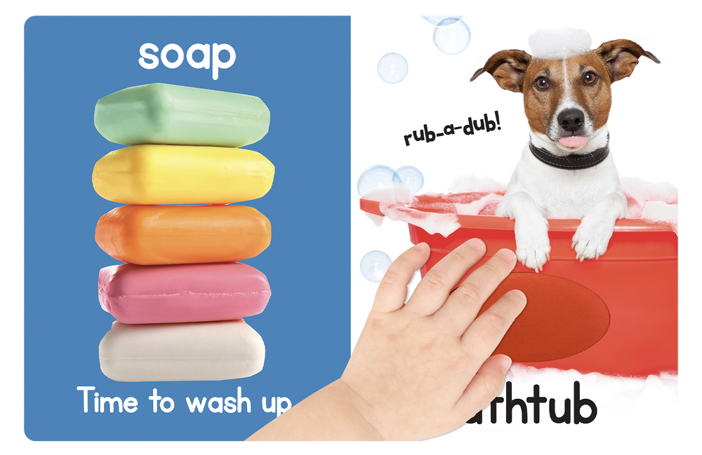 Explore bath time fun and teach first words from soap to bathrobe in this touch and feel board book. Perfect for little hands to hold and explore, this sensory book features a variety of materials to touch and feel.