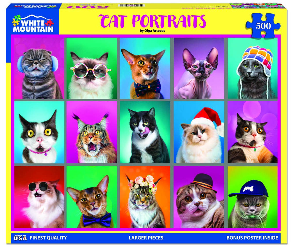 1850pz Cat Portraits. Strike a pose! Shock, annoyance, and boredom are a few of the expressions that can be described in this collage style puzzle. Artist Olga Artbeat gathered a wide variety of felines for this fabulously fascinating photomontage. 500-piece jigsaw puzzle. Finished size of this puzzle is 18" x 24".