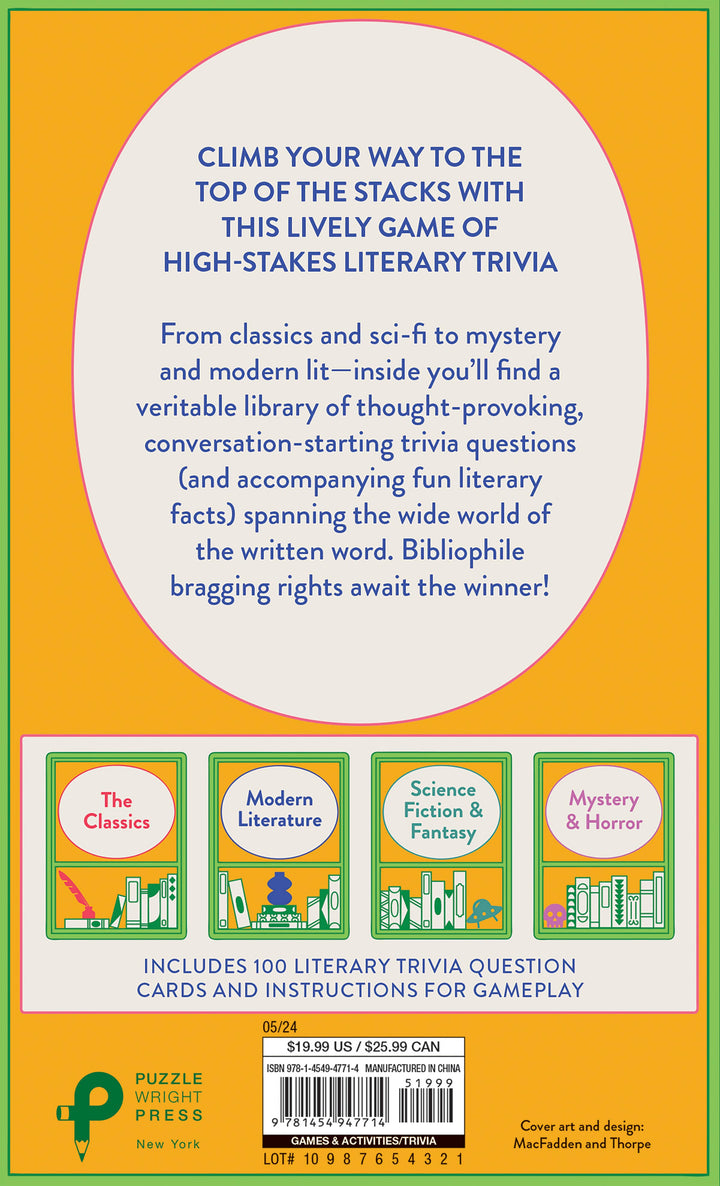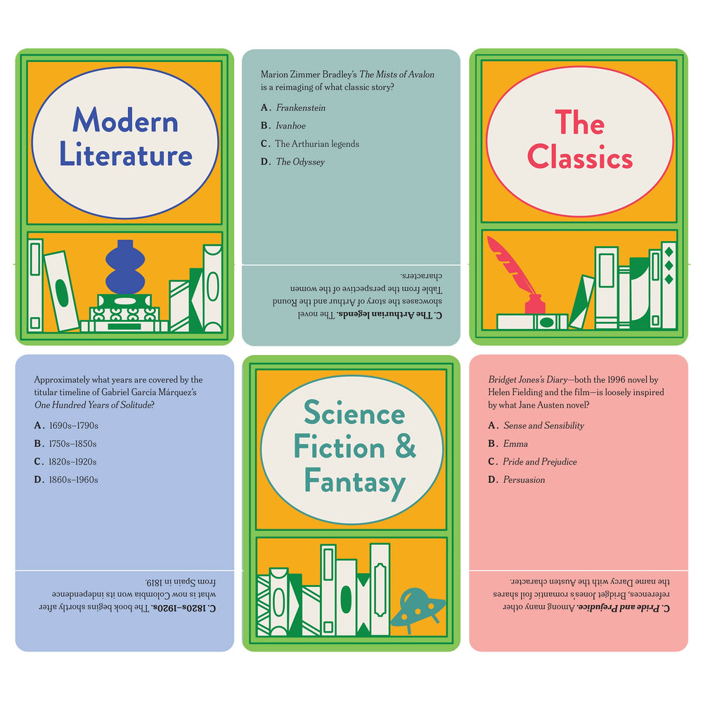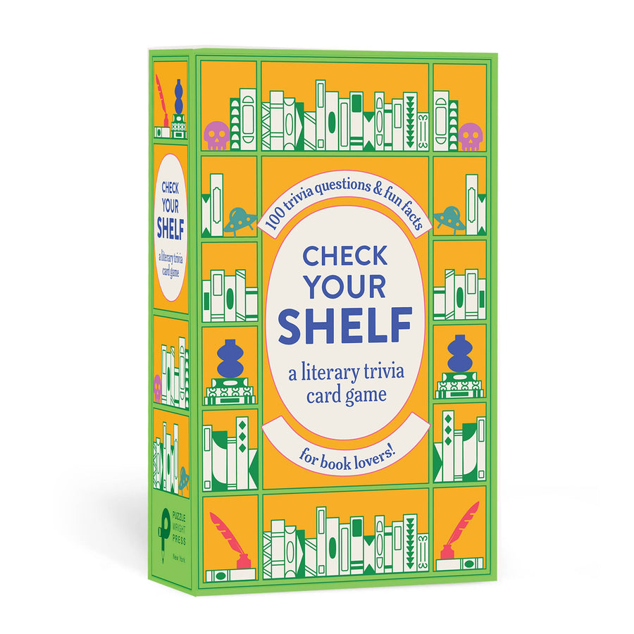 The ultimate game for book lovers, bibliophiles, and trivia enthusiasts everywhere, Check Your Shelf features 100 entertaining and conversation-sparking questions from the world of literature, past and present. Check Your Shelf features 100 game cards divided into four color-coded genre categories with multiple-choice questions: Classics (pre-20th-century literature) Modern Literature (20th and 21st century works), Mystery/Horror, and Sci-Fi/Fantasy. The package itself, featuring a hinged lid and a curved "spine," evokes an actual book. Kit; 4 1/2 X 6 5/8 inches; pages.