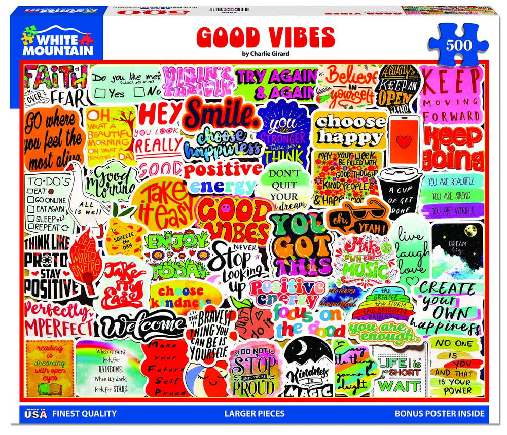 1999 Good Vibes. You Are Enough! Focus on the Good! Perfectly Imperfect! Artist Charlie Girard gathered a group of inspirational stickers that will turn any bad day into a great one in this 500 piece collage style jigsaw puzzle. Finished size of 18” x 24”.