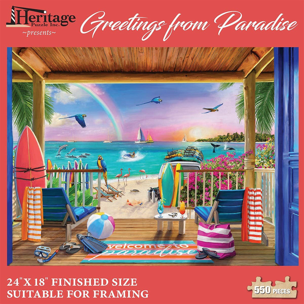 Greetings from Paradise! We wish you were here to join us as we take a moment to relax on the beach or spend the day chasing adventure in this tropical haven. With wildlife all around and beautiful bungalows you will have lots to look forward to with this puzzle. 550 pieces of colorful puzzling awaits! 24" x 18"