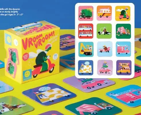 Match speedy vehicle pairs! Build fine motor and memory skills with this dynamic matching game, featuring trucks, buses, race cars, and more on sturdy, brightly colored tiles. Perfect for stocking stuffers, party favors or on-the go! Ages 3+