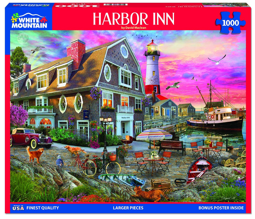 1794pz Harbor Inn. As the sun sets on the harbor, guests are settling into the Harbor Inn. A buggy sits outside, the baby resting soundly inside the inn, while the pets enjoy the last bit of sunlight. The sky is alight with brilliant shades of pink, blue, and purple. The boats have docked for the night and lobster traps are stacked neatly awaiting tomorrow’s excitement. Artist David Maclean invites you to enjoy the sunset outside the Harbor Inn in this 1000 piece jigsaw puzzle. Finished size 24" x 30".