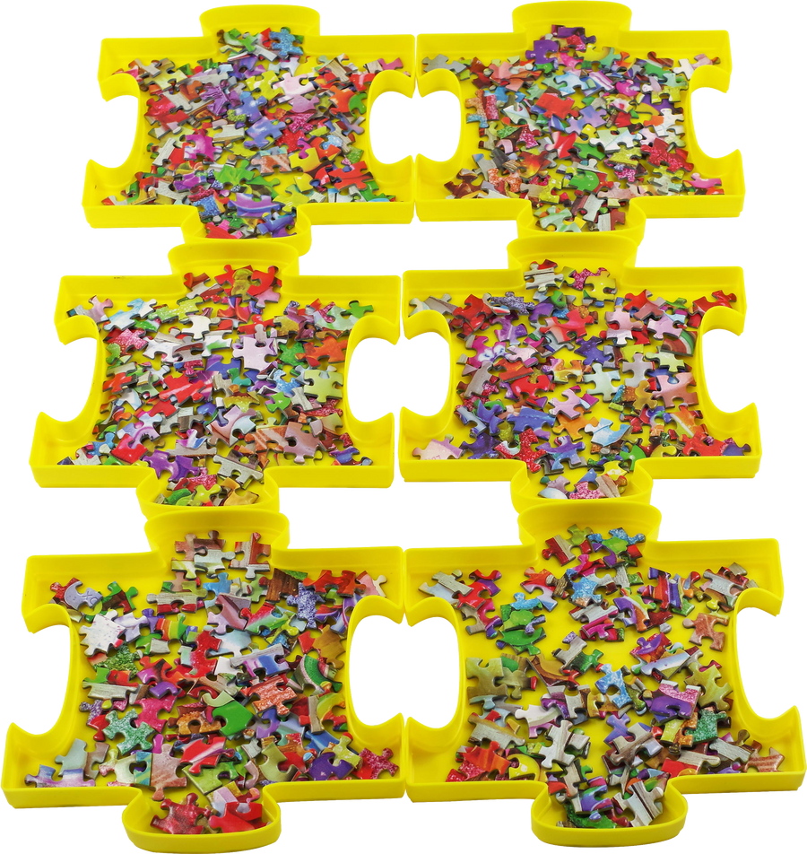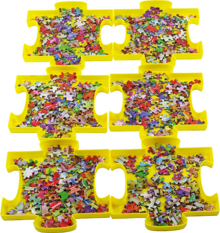 Divide and conquer! Make solving jigsaw puzzles a snap with Puzzle Sorting Trays ! Never worry that you'll lose a puzzle piece! Use these handy trays to sort pieces by color, shape, pattern, or theme, as you work on your latest puzzle. Trays join together for easy organization. Trays make it easy for several people to work on a puzzle all at once. Set includes 6 sturdy plastic trays. (Need more? Simply add additional sets.) Trays are stackable for easy, space-saving storage. Bright yellow trays are made in fun puzzle-piece shapes. For puzzles up to 1,000 pieces. Each tray measures 7.48'' square x 3.9'' deep. Set of 6 trays comes boxed. Box measures 7.5'' wide x 7.5'' high x 4'' deep.