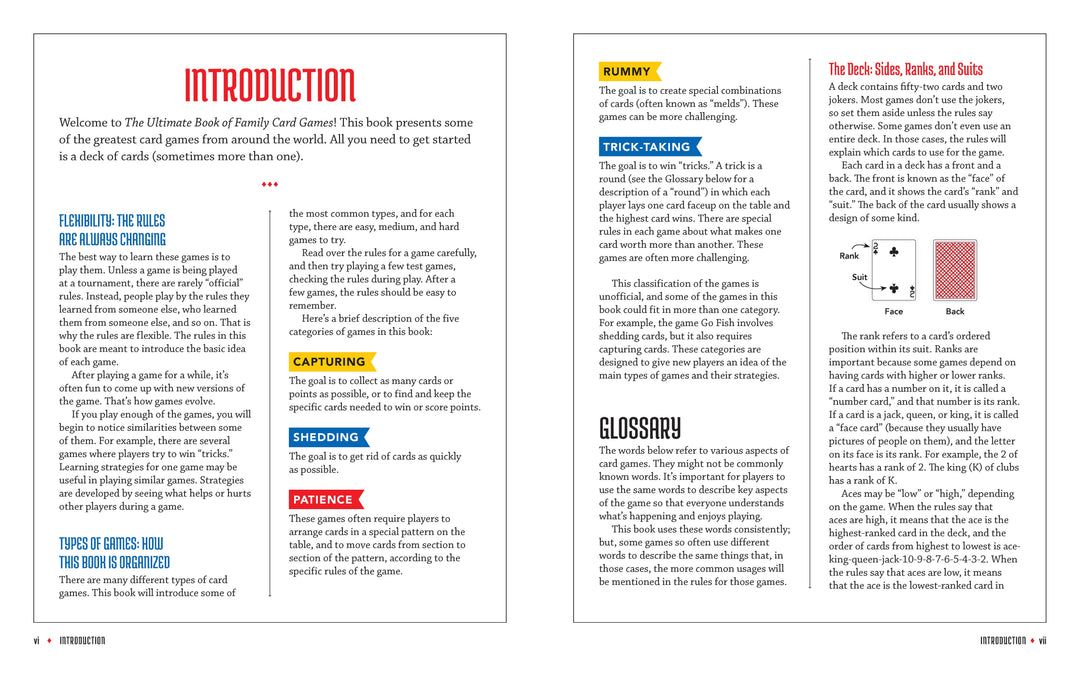 Pick a card game—any card game! Everyone loves to play cards, and this ultimate collection has all the fun favorites (including rummy, spades, war, old maid, go fish, snip snap snorem, and hearts), plus some similar but less widely known games that families will love exploring. There are over 50 games in all, organized by type and difficulty, complete with instructions, rules, strategies, color illustrations, and a brief note on each game's origins. Trade Paperback Book; 8 x 10 inches; 128 pages.