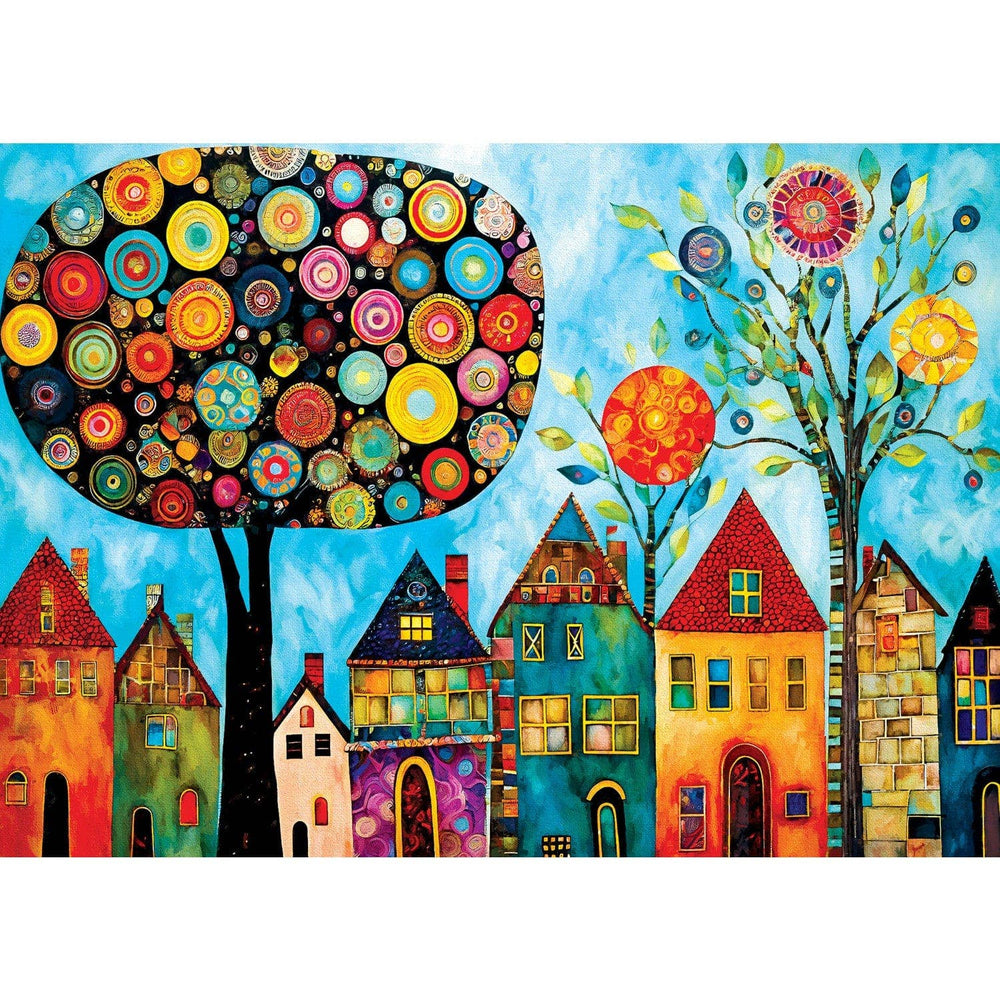 A small, vibrant town brought to life in a bright, modern folk art style. The buildings, each uniquely painted in bold, cheerful colors like sunny yellows, deep blues, and vivid reds, line the winding streets, their facades adorned with whimsical patterns and playful details. Windows and doors are framed by intricate, hand-painted designs, and rooftops are dotted with charming chimneys and weather vanes. The town square, bustling with life, is filled with townsfolk depicted in joyful, animated poses, their attire as colorful and diverse as the buildings. Trees with oversized, stylized leaves and flowers in exaggerated, radiant hues dot the landscape, adding to the lively atmosphere. The sky above is a clear, bright blue, with fluffy, decorative clouds that seem to float like cotton candy. This enchanting image captures the heartwarming essence of community and creativity, blending tradition with a contemporary twist in a delightful, eye-catching composition.