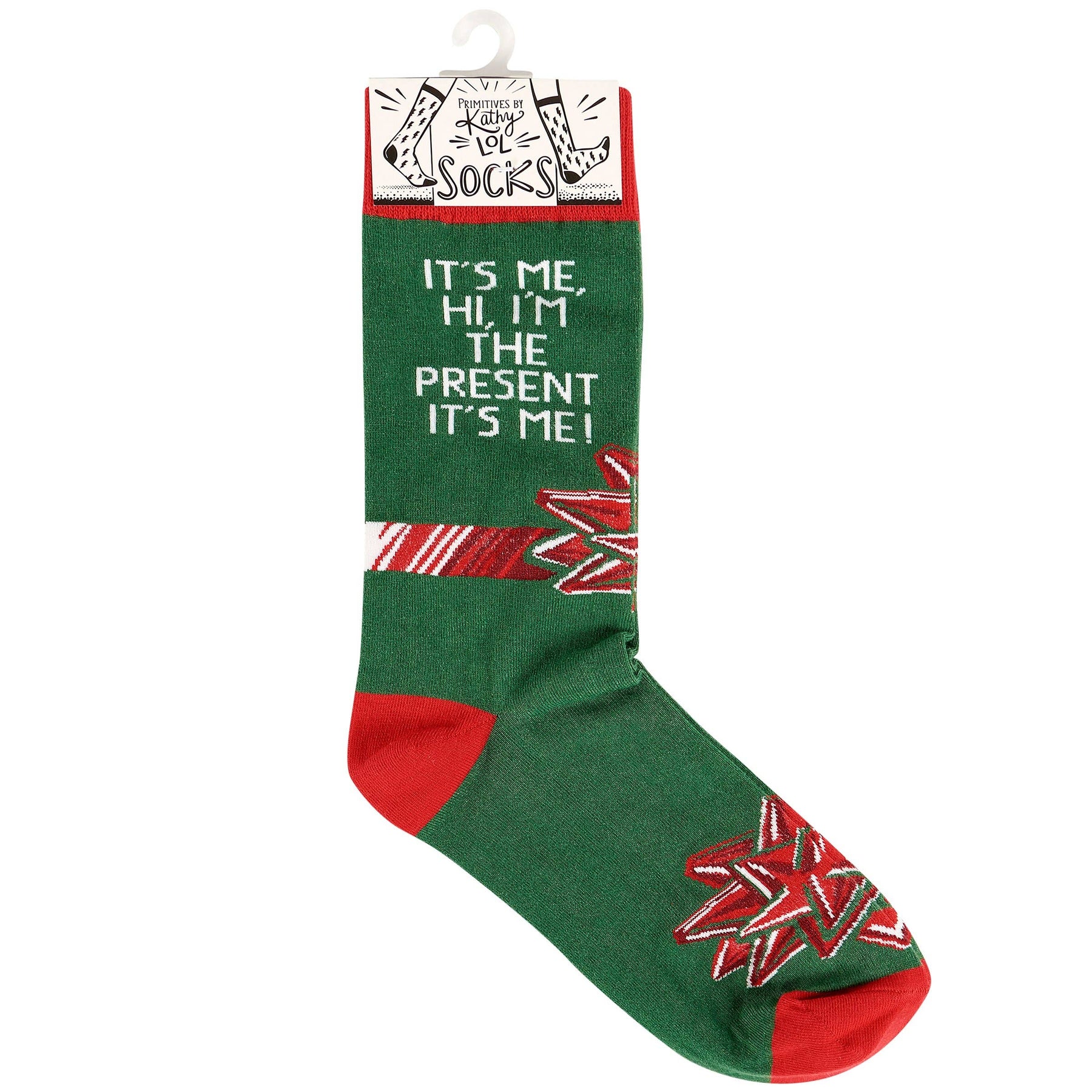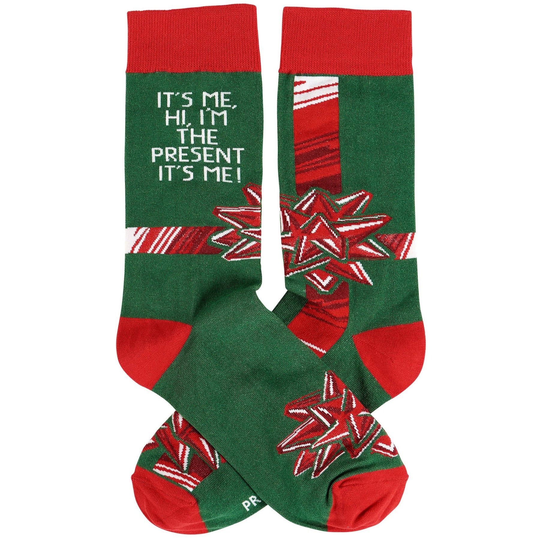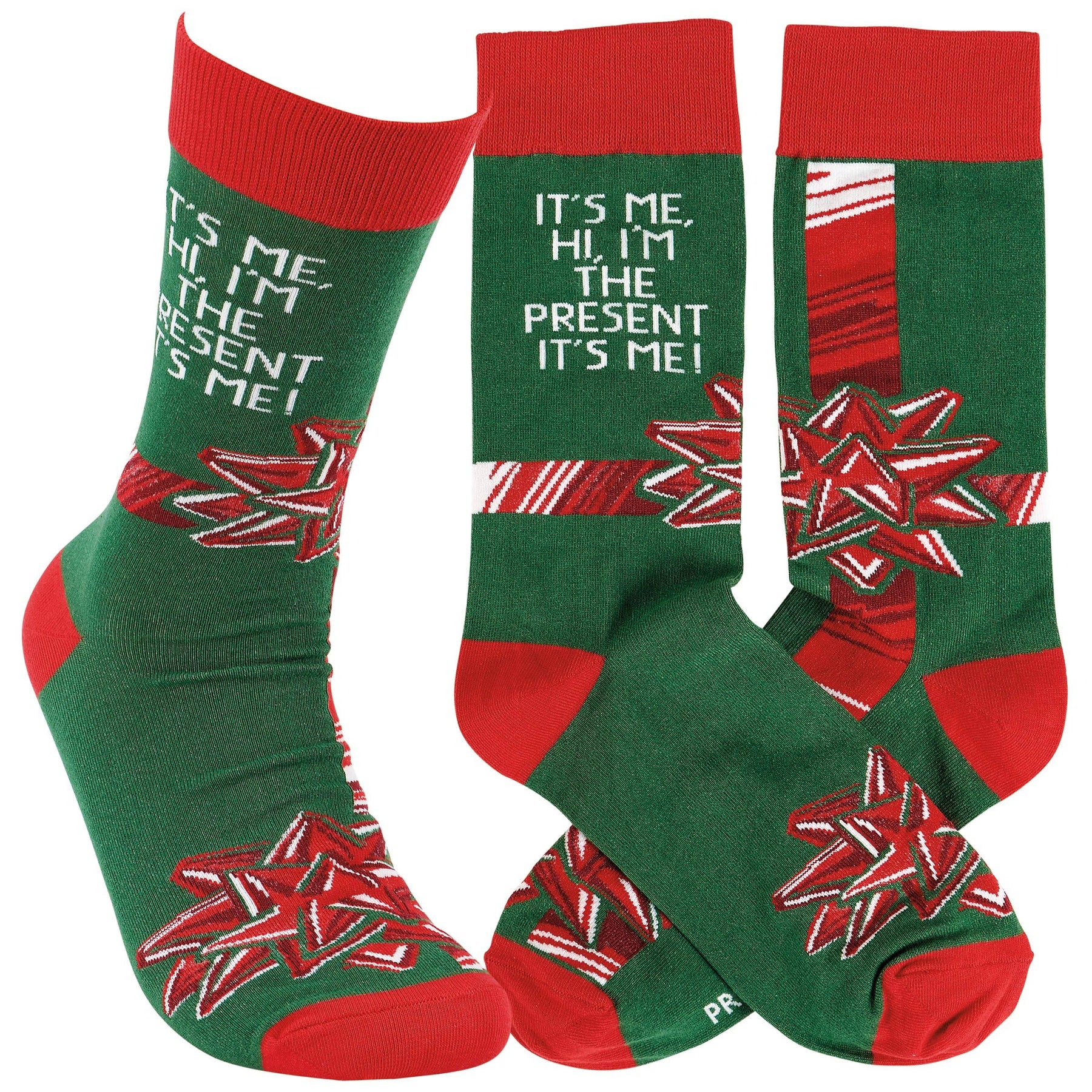 A pair of colorful socks from our Christmas Collection displaying playful hand illustrated designs of Christmas gift ribbons and bows with a humorous seasonal sentiment that reads "It's Me, Hi, I'm The Present. It's Me!" These giftable socks are made with a cotton, nylon, and spandex blend for a one size fits most design. Our I'm The Present socks come with a decorative header card and a clear plastic hanger for easy rack display and gifting. A funny Christmas gift perfect for seasonal self-expression.