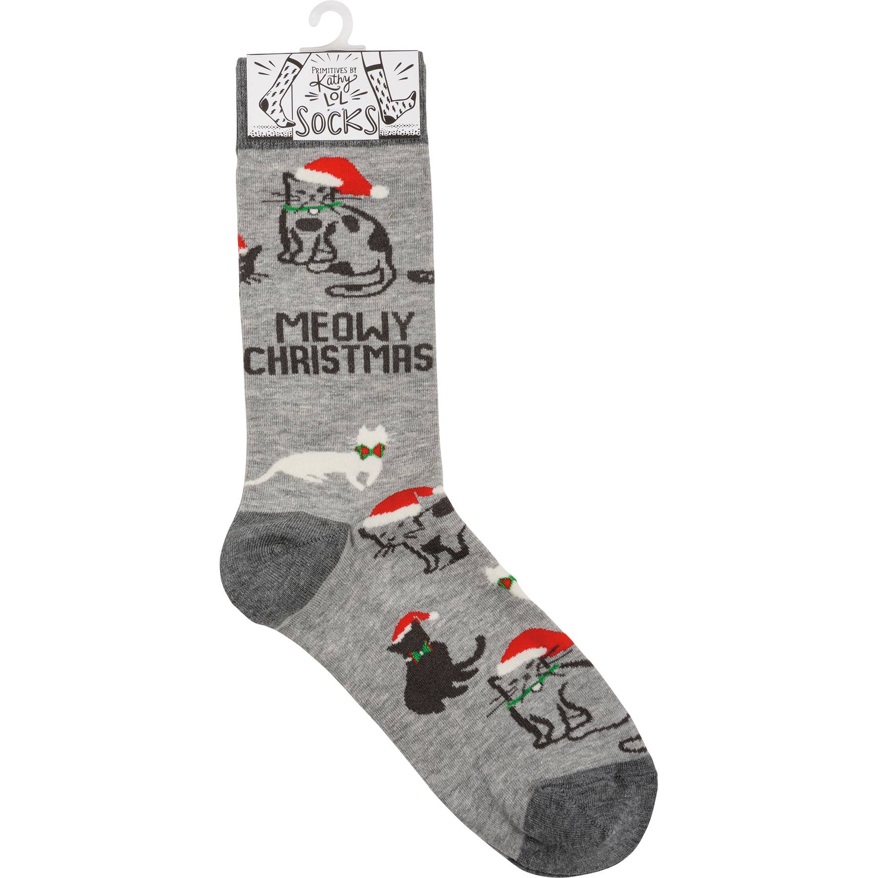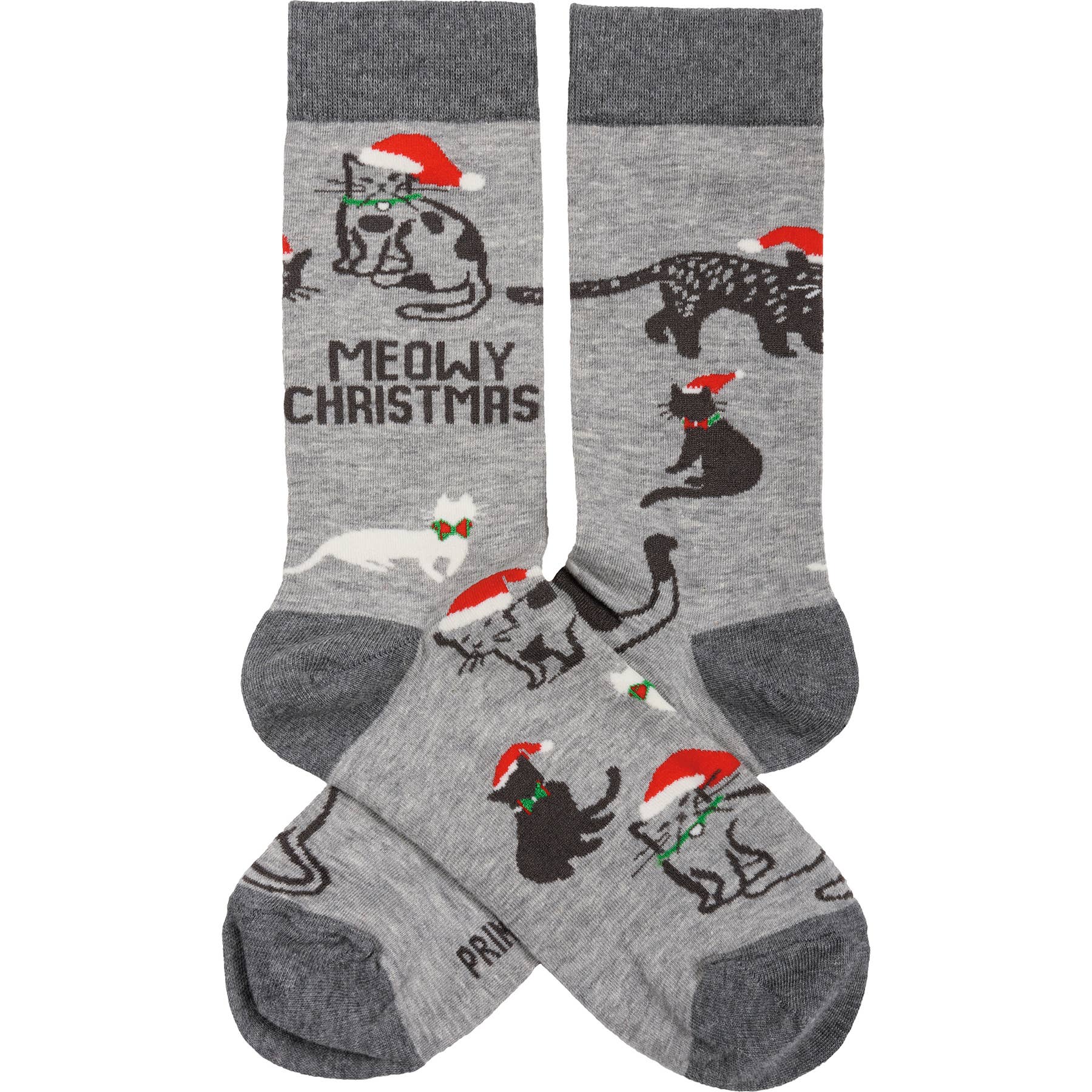 These colorful socks feature woven cat and winter clothing designs with a "Meowy Christmas" sentiment. Cotton, nylon, spandex. Our Meowy Christmas socks are one size fits most.