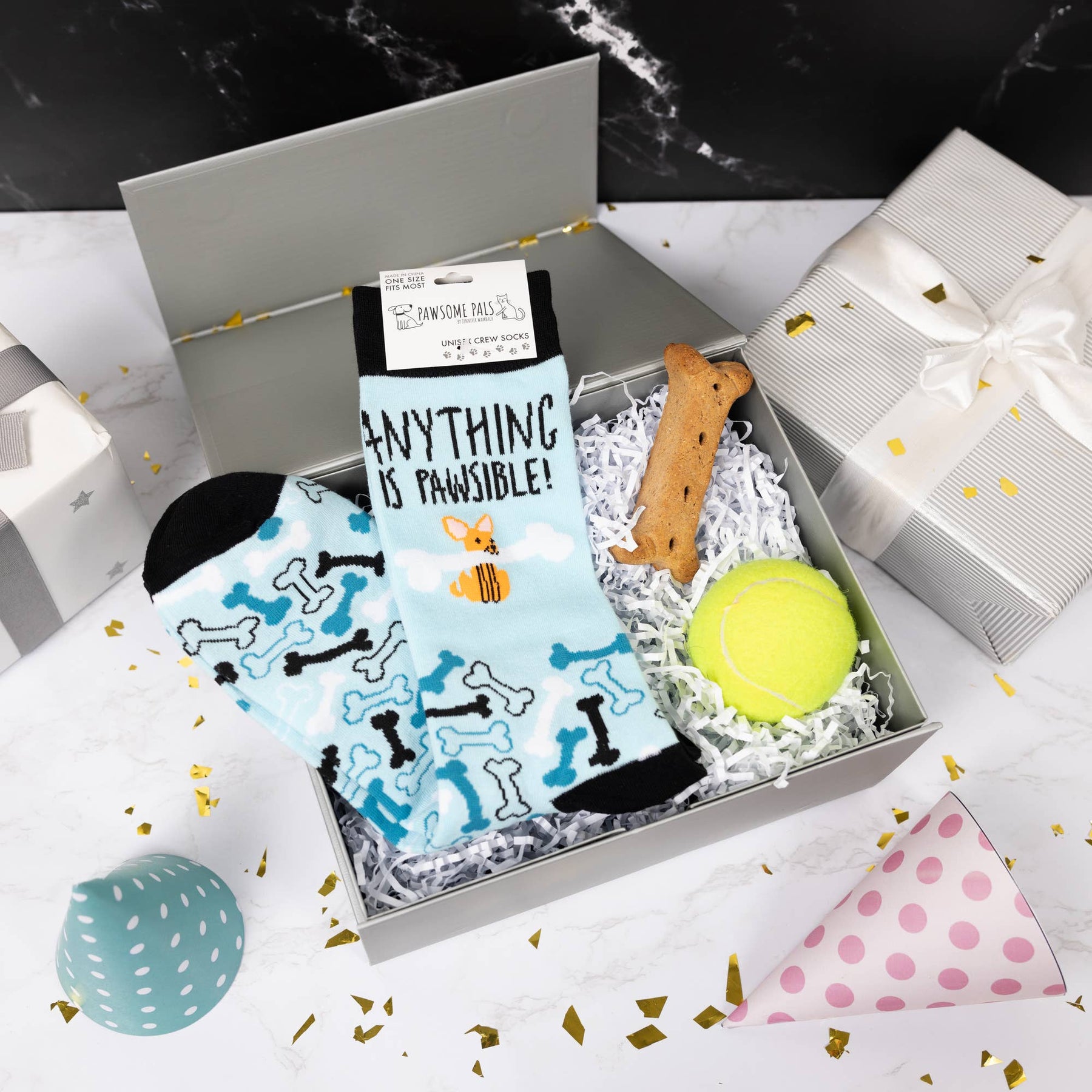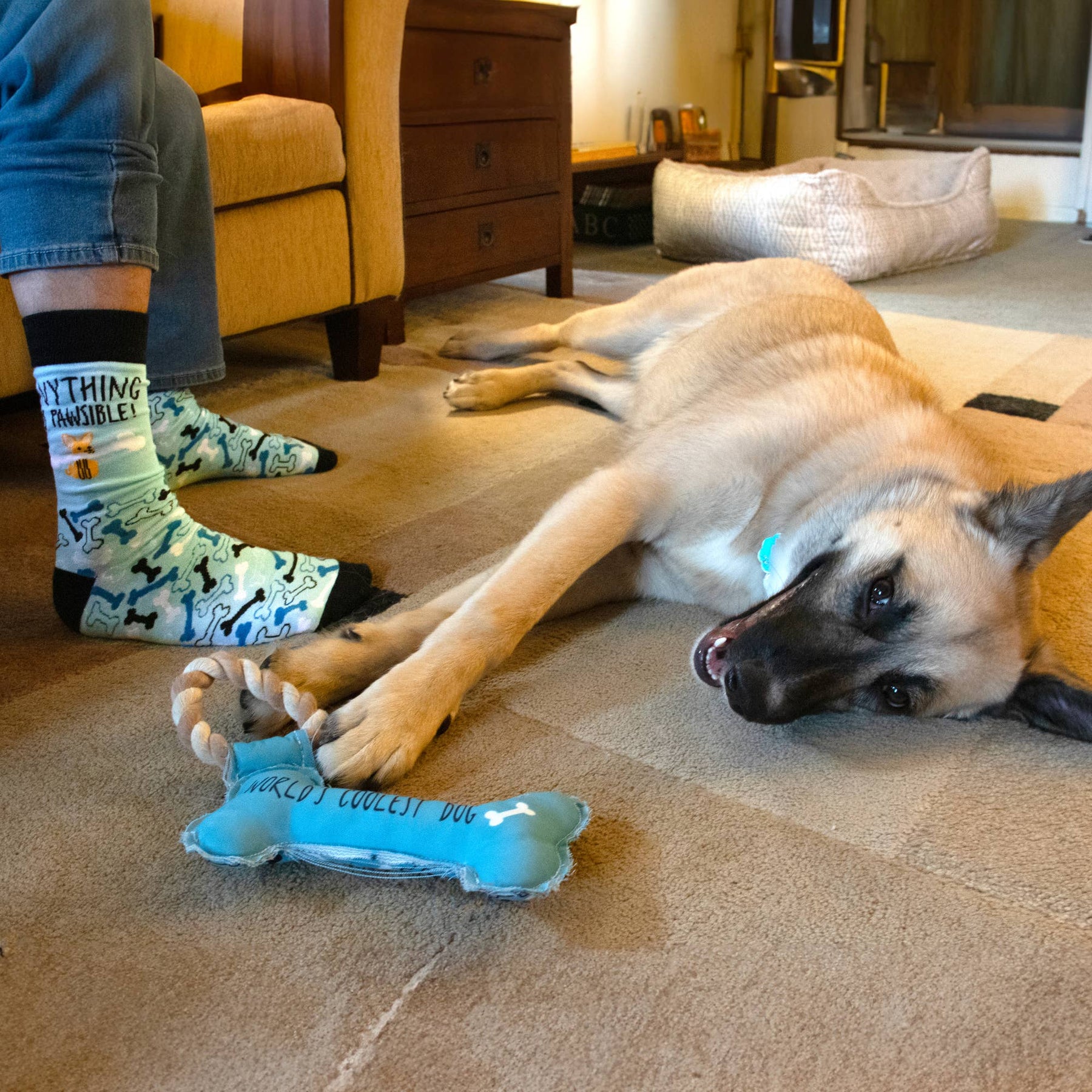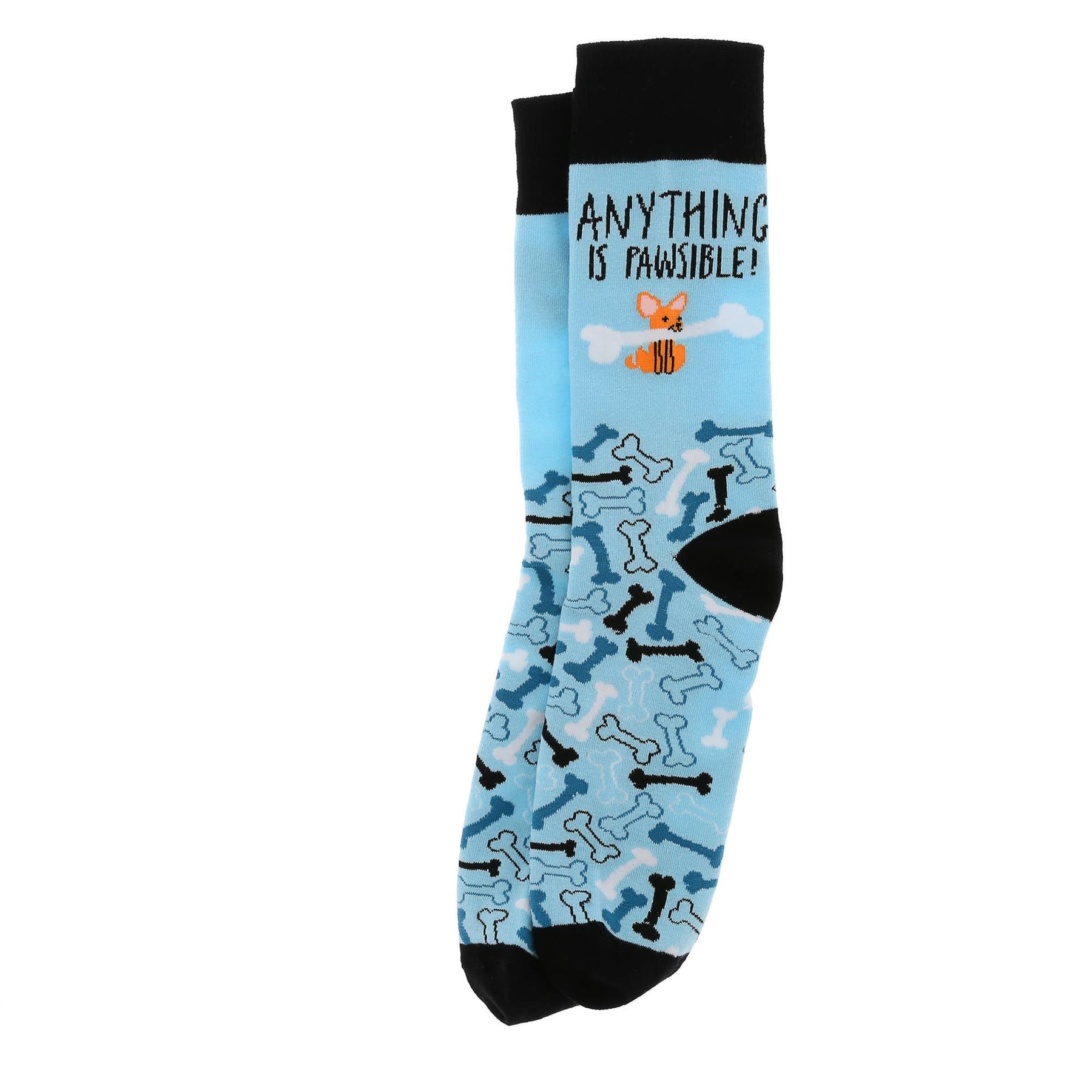 These M/L 9-13 U.S. Women & 8-12 U.S. Men unisex patterned crew socks come about halfway up the calf. They are a soft, stretchy blend of 70% cotton, 28% polyester, and 2% spandex. . The light blue body has a white, dark, blue, and black dog bone outline and silhouette pattern accompanied by a black "Anything Is Pawsible!" sentiment on the outer ankle of each sock. The small orange chihuahua dog sits below the wording with an oversized white bone in his mouth. The ankle, heel, and toe are all black. Machine wash cold on a gentle cycle with like colors. Tumble dry low. Never bleach or iron. It is packaged in a plastic polybag and secured to a hangable thick cardboard sleeve that contains care instructions and sizing information. This is a beautiful gift for pet parents of a snuggly K9 puppy doggy dog adopted friend. Dog moms and dads will be excited to wear some fun socks. So give your dog lover friend the best pair to add to their collection.