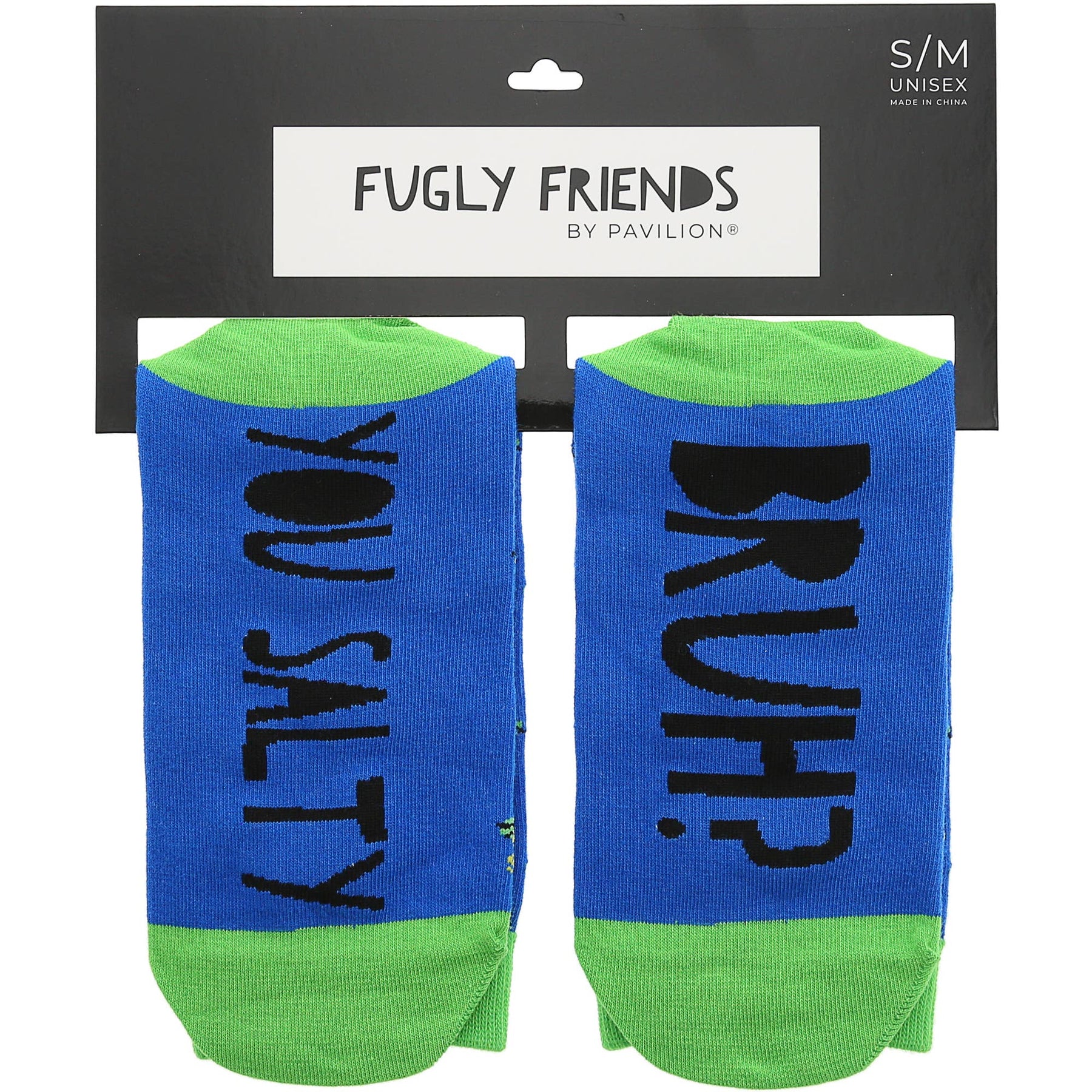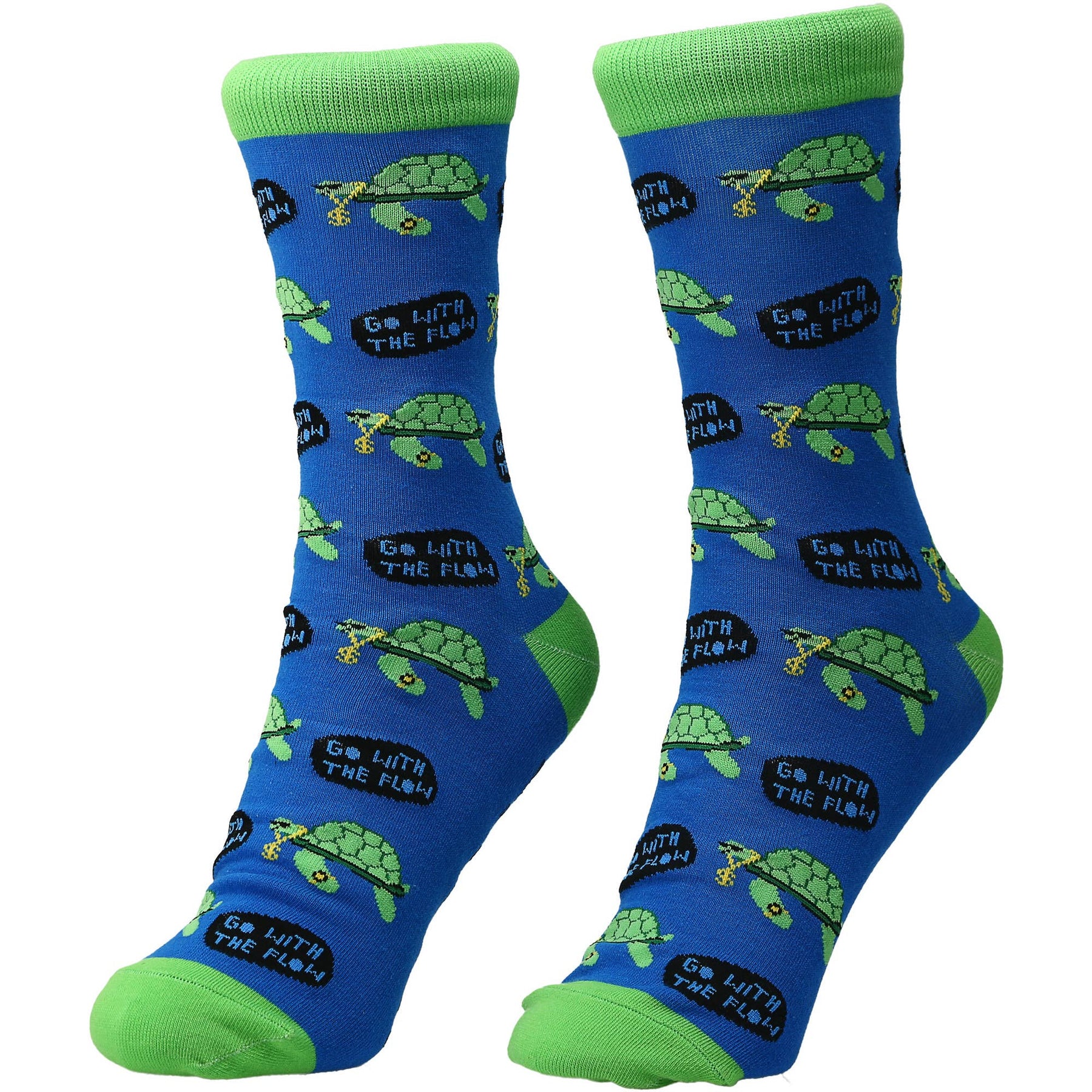 These S/M unisex patterned crew socks come about halfway up the calf. They are a soft and stretchy blend of 70% cotton, 28% polyester, and 2% spandex. S/M socks fit sizes 4-9 US Women & 5-8 US Men. We also have an M/L sizing available for separate purchase, including 9-13 US Women & 8-12 US Men. Green ankle, heel, and toes are attached to an overall blue body. The turtle characters wear black sunglasses, a gold money sign necklace, and a gold watch—repetitive black speech bubbles with "GO WITH THE FLOW" in blue font. One sock bottom has "YOU SALTY" sentiment while the opposite sock has "BRUH?" sentiment in black. Machine wash cold on a gentle cycle with like colors. Tumble dry low. Never bleach or iron. . These humorous turtle socks are great for giving to co-workers, turtle lovers, ocean sea vacation lovers, or oceanographer friends. Packaged in a plastic polybag and secured to a hangable thick cardboard sleeve that contains care instructions and sizing info.