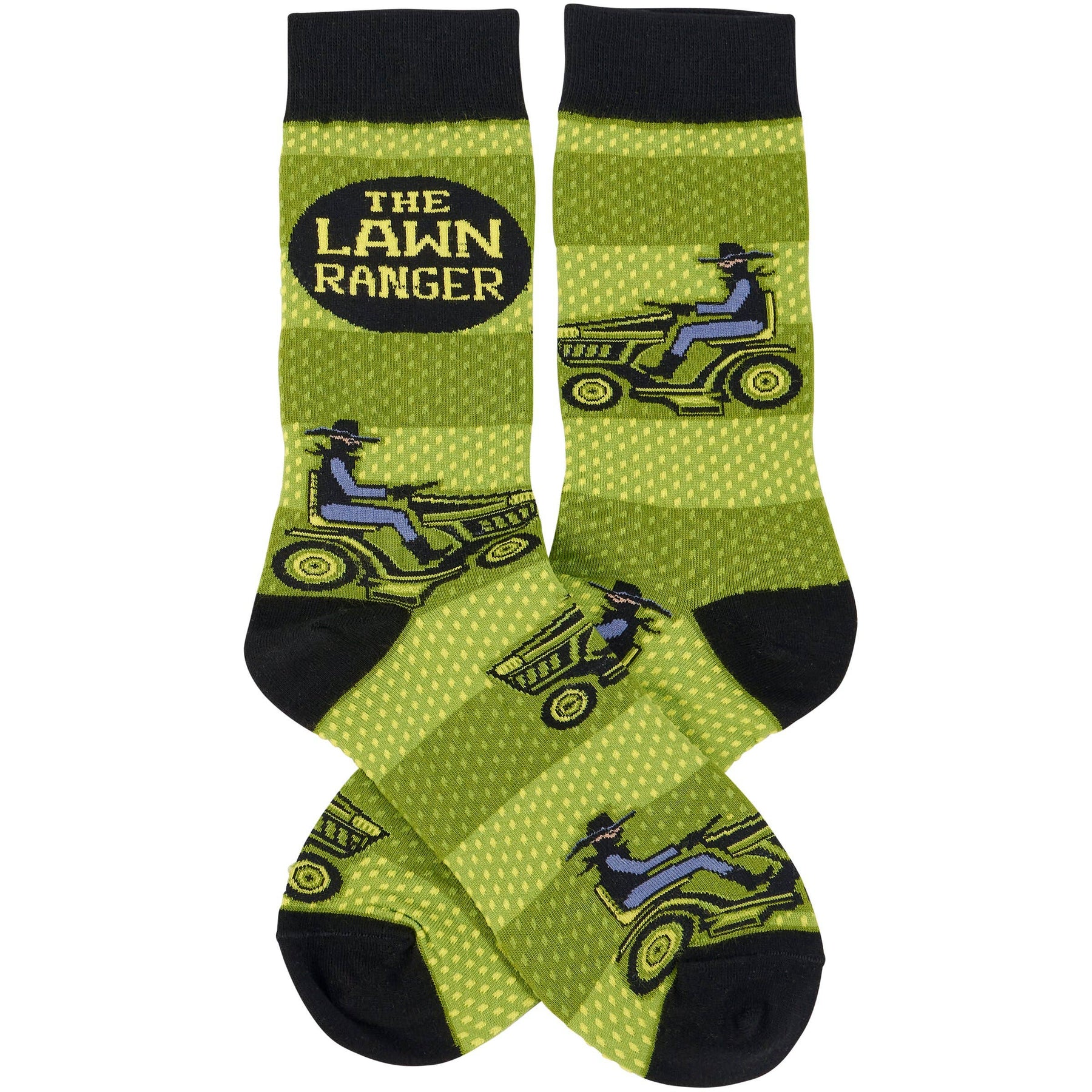A pair of colorful socks from our Father's Day Collection displaying playful hand illustrated designs of people dressed like a Texas ranger riding lawn mowers with a fun dad themed sentiment that reads "The Lawn Ranger." These giftable socks are made with a cotton, nylon, and spandex blend for a one size fits most design. Our The Lawn Ranger socks come with a decorative header card and a clear plastic hanger for easy rack display and gifting. A fun father's day gift perfect for everyday self-expression.