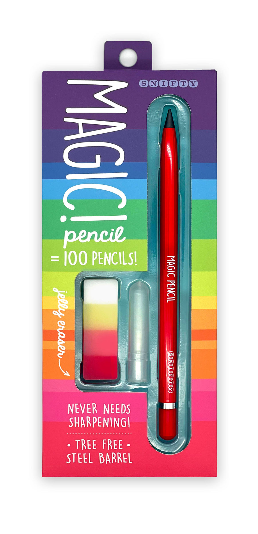 The MAGIC PENCIL never needs sharpening! Its compressed graphite tip equals 100 regular pencils, so you can keep on writing, and writing, and writing, and writing, and writing, and writing, and writing.... Beautifully packaged with a chunky matching eraser and protective cap. Super strong steel barrel. Tree-free & earth-friendly! Red barrel, red, pink and yellow eraser Colorful box with hang tab - 7.65" x 3.5"