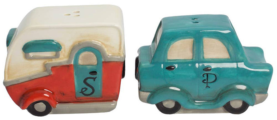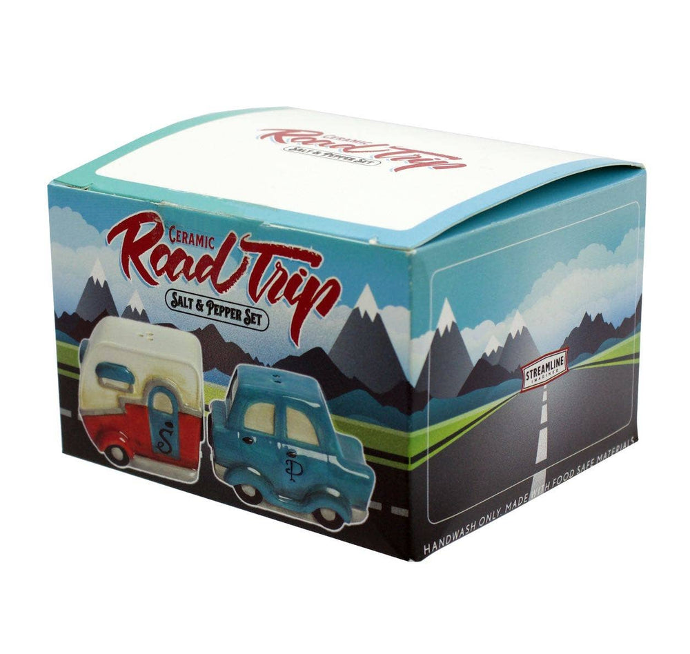 Get into road trip mode, and ready your tastebuds for an awe-inspiring adventure with a salt and pepper shaker set ready for the open road! This Road Trip Salt & Pepper Set is skillfully hand crafted, using quality food-safe ceramic material, and glazed with colors that give it a touch of retro nostalgia. Sure to liven up any kitchen or tablescape, this salt & pepper set is a very special gift for birthdays, holidays, give-aways, events of all kinds - and yes, the perfect stocking stuffer!! Includes a removable base plug for ease of filling and washing (by hand only). Take the scenic route and bring these vintage salt & pepper shakers to your table as a reminder of the joys of riding on the open road!