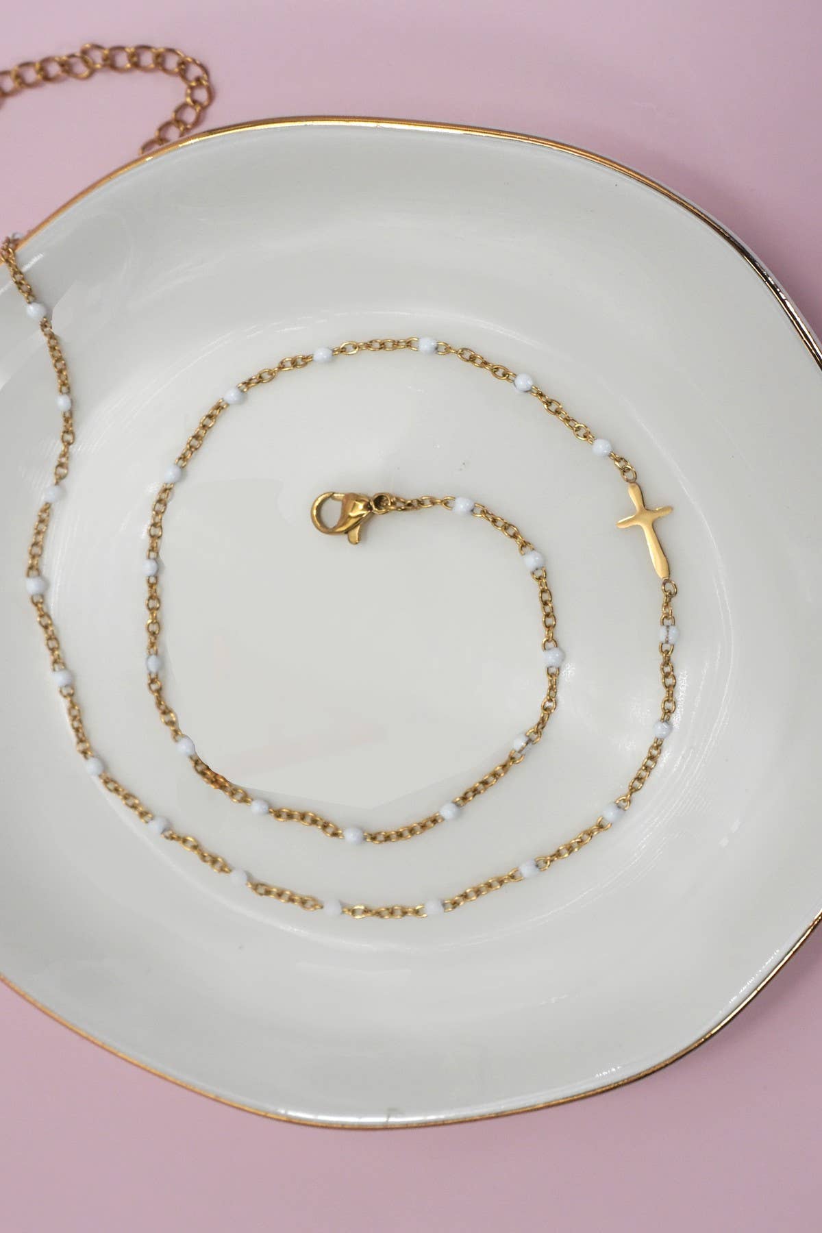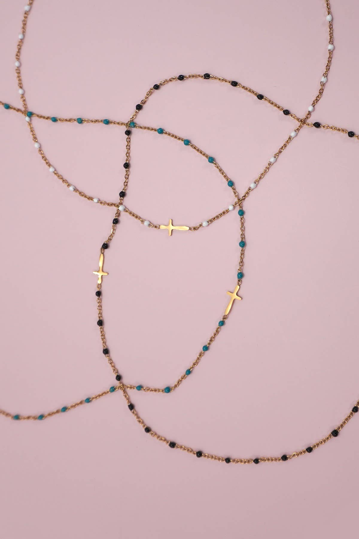 18K Stainless Steel Tarnish-Free Cross on a Beaded Necklace. Crafted from high-quality stainless steel with an 18K gold finish, this necklace is designed to resist tarnish and maintain its shine. The beautiful faith cross charm on a beaded stainless steel necklace.