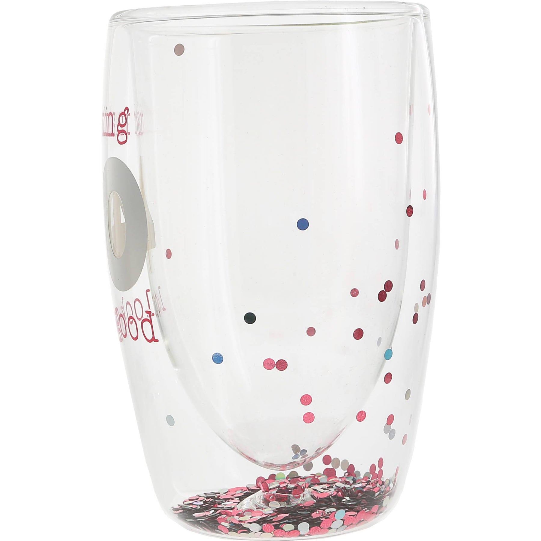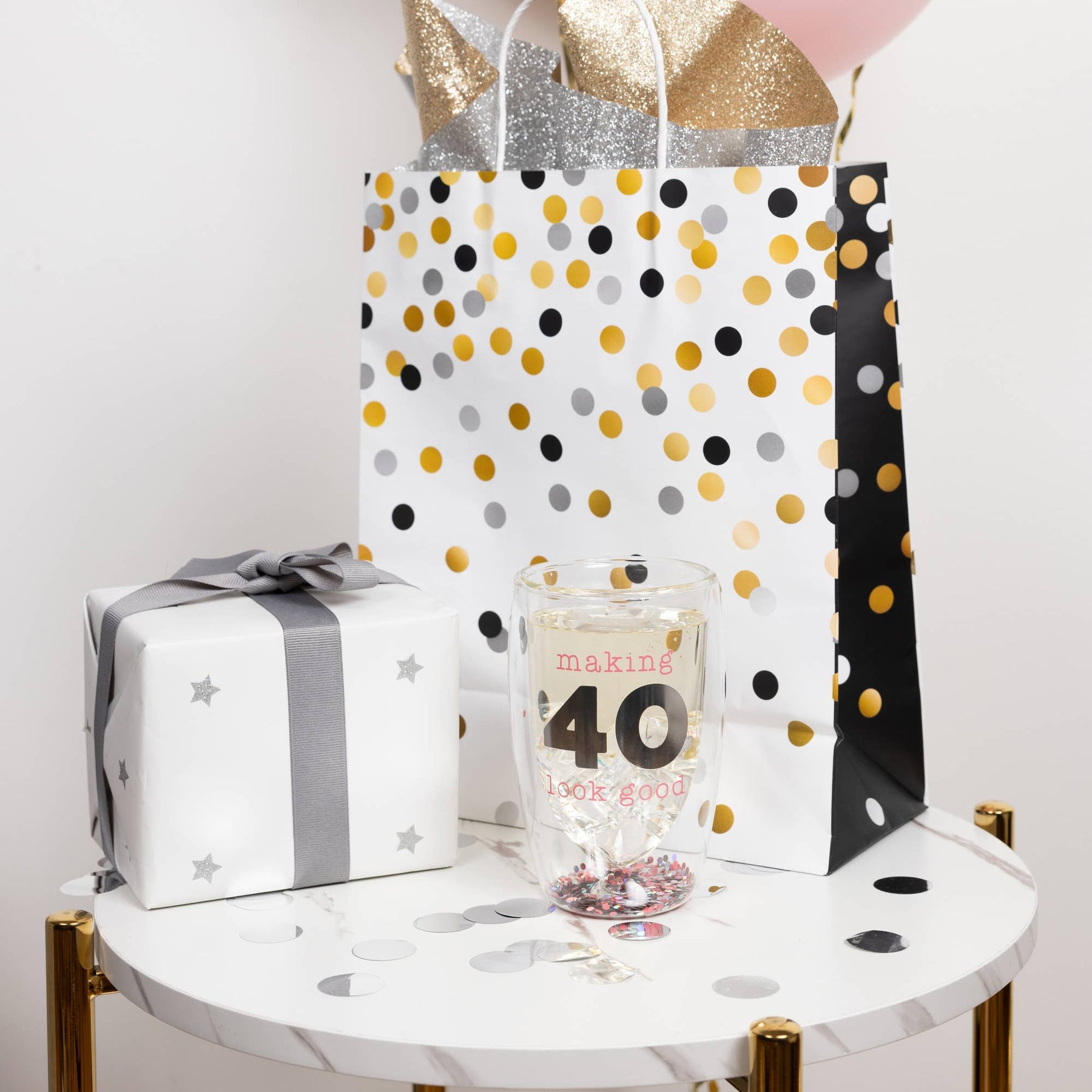 14 oz double-walled drinkware is made from borosilicate glass. Between the walls, there is freely moving confetti. The front of the glass has a pink and metallic silver sentiment, "Making 40 Look Good." The round confetti is pink and iridescent. Soft hand wash only. Do not leave soaking in water for extended periods of time. Dry immediately. It is packaged in a die-cut box. Celebrate a loved one's birthday; this unique glassware will brighten their day. Throw a party commemorating the past year and the years ahead with a cup they can use in the year ahead. Add small hair accessories, sweet chocolate treats, pens, and other desk essentials to display this unique glass for the year. An added bottle of Merlot, Riesling, Chardonnay, Gewürztraminer, Sauvignon Blanc, Malbec, Zinfandel, Pinot Grigio, and red or white wine lovers brings this item to its prime.