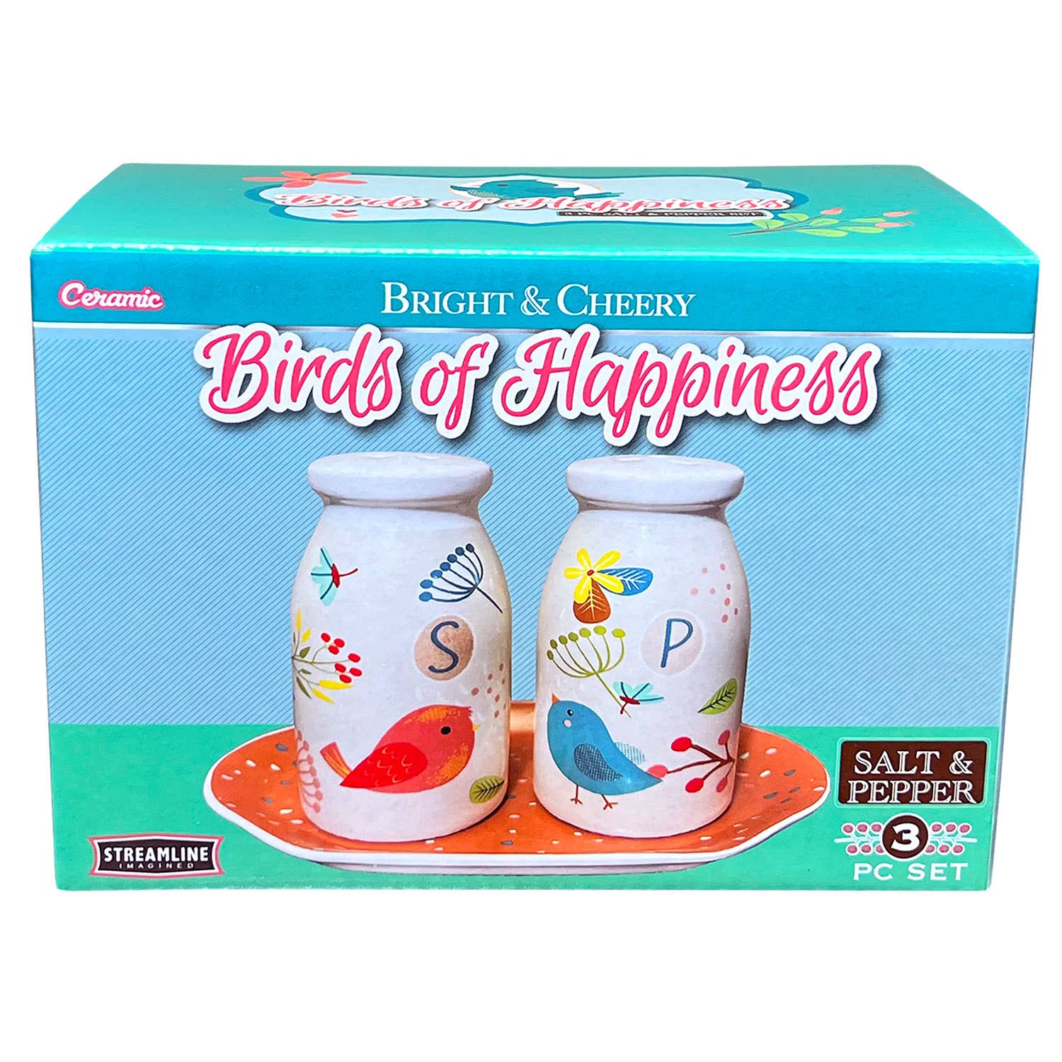 Introducing Streamline's new "Birds of Happiness" Collection with this salt and pepper set, beautifully patterned with earthy colors and blue birds that makes you feel like you are back on the homestead. This salt & pepper set comes complete with matching plate to hold the pair. Pattern to match any kitchen decor.
