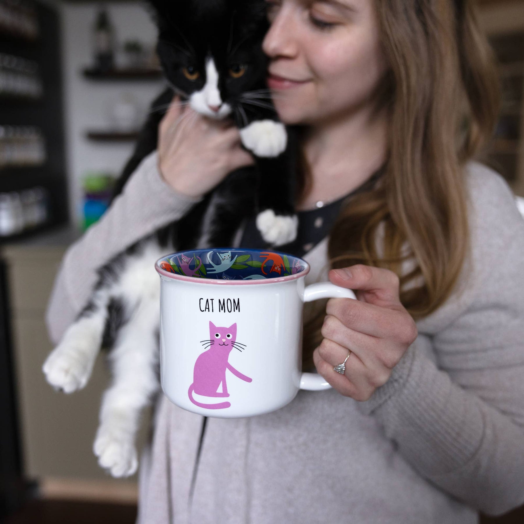 This modern-style stoneware mug is not just a mug; it's a statement piece. Its 18 oz capacity makes it perfect for your morning coffee or a cozy evening tea. The large handle is designed for comfort, and the curved lip enhances your sipping experience. The glossy finish adds a touch of elegance to its bold and versatile look, making it a perfect addition to any kitchen or office space. The mug's front features a purple cat sitting with the sentiment "Cat Mom." The lip of the mug is purple, and the interior is blue with leaping blue, red, and purple cats with greenery. We understand that convenience is critical in your busy life. This stoneware mug is dishwasher and microwave-safe, making it easy to clean and use. It is also packaged in a die-cut box for safe shipping, ensuring it arrives in perfect condition at your doorstep. .