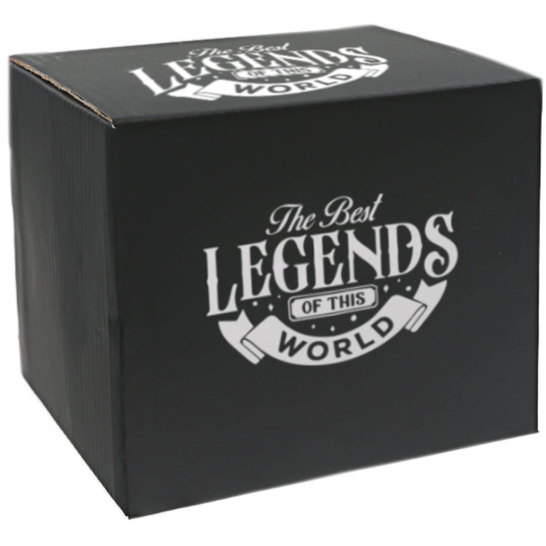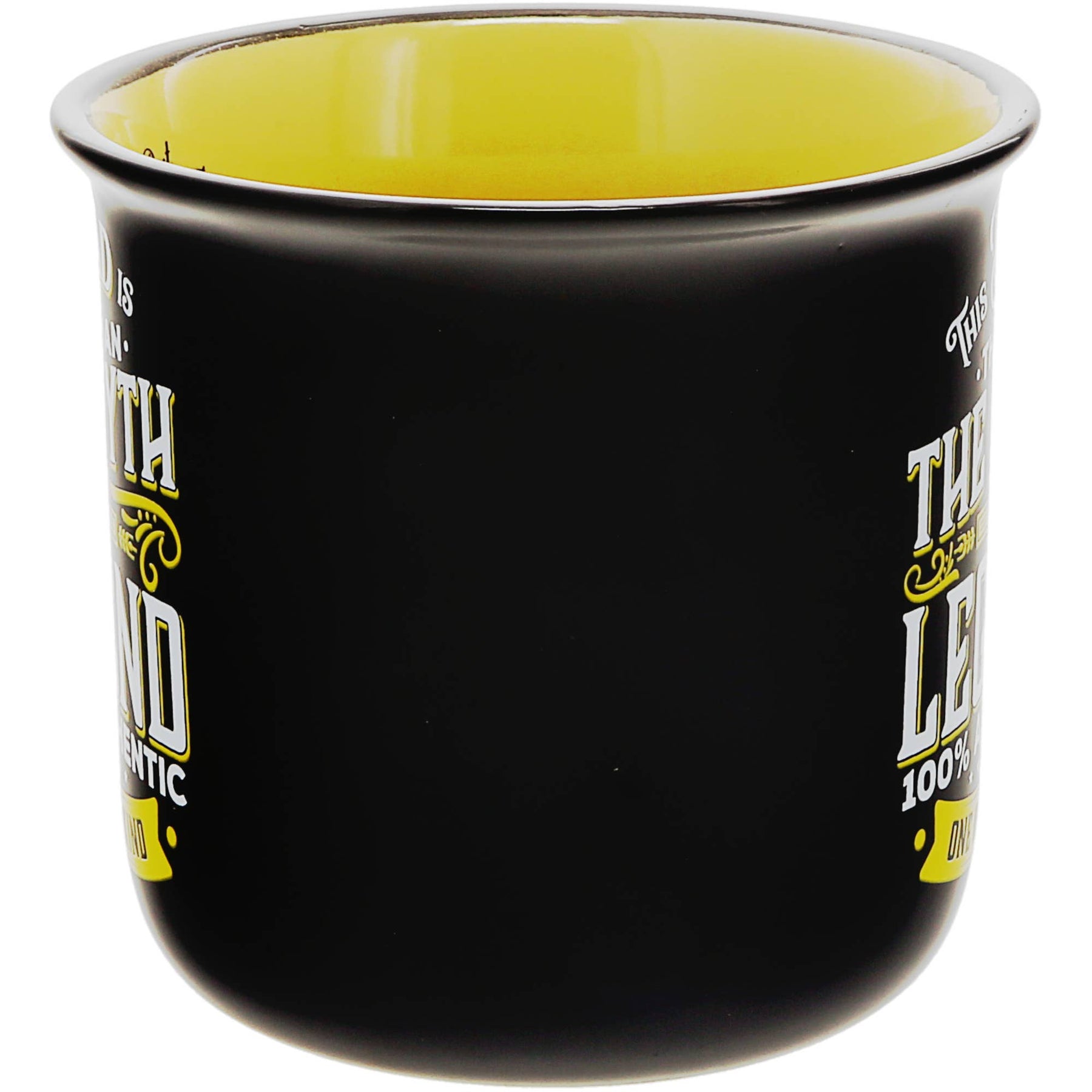 This 13 oz double-sided design mug features a comfortable handle, smooth straight walls, an easy-to-sip curved lip, an overall glossy finish, and bold pops of color on the interior and exterior of the drinkware. "This Dad Is The Man, The Myth, The Legend, 100% Authentic, One Of A Kind" decal is in full caps, black and white, with multi-directional lines of words intertwined with yellow swirls and banners which stand out on the stark black exterior. The bright yellow interior has a black "Legends Of This World" logo on the interior only when the handle is facing to the right side only. Dishwasher and microwave safe. Prop 65 certified. Package in a protective die-cut box. A great unique present for Father's day from wife to husband, son to dad, daughter to dad, or any fatherly figure who deserves an encouraging special reminder message. As they sip their coffee, tea, hot chocolate, or other drink of choice, they'll think of you, even when you can't be by their side.