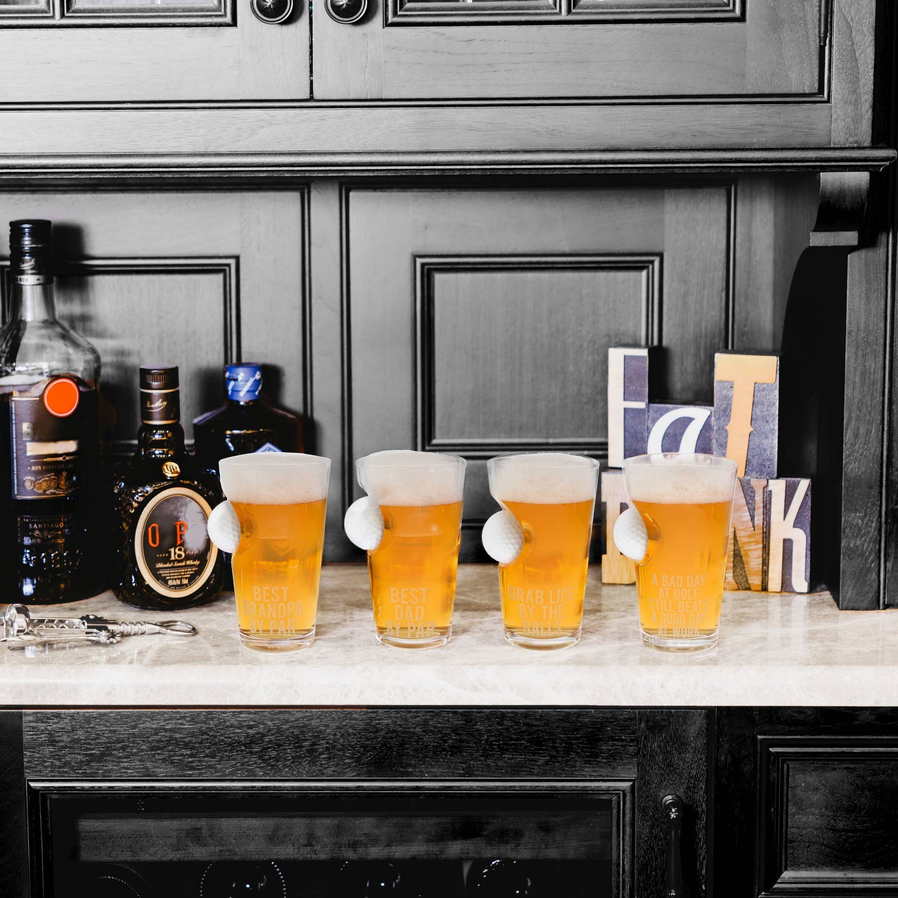15 oz pint glass has a thick bottom and thinner sides. This unique one-of-a-kind drinkware features a securely glued real golf ball on the left side of the cup. The "Best Grandpa By Par" design is etched into the front bottom center of the beer stein. Hand wash only with the soft side of the sponge - gently wash the design. Prop 65 approved. Packaged in a die-cut box. A wonderful and memorable present for beer-lover, golf-lover, and men who have a passion for placing a tee in the grass; swinging the driver, the woods, the irons, the hybrids, or the putters; riding around on the cart on beautiful sunny days, and hanging out with friends. Remarkable for any fatherly figure in your life, including stepdad, father-in-law, foster dad, adoptive dad, or any other man who has blessed your life. Best for birthdays, Father's Day, or other holiday celebrations. Give dad, daddy, or father the gift of his favorite new glassware.