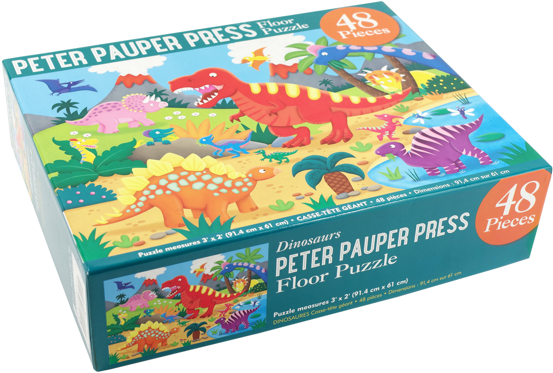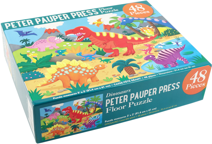 Let your kids have fun and be challenged by this bold Dinosaurs Floor Puzzle ! Precision-cut pieces fit snugly. Pieces are extra thick. Dino puzzle will immerse your child in a primeval world with erupting volcanoes, a T-Rex, a triceratops, a stegosaurus, and more! Vivid full-color images. Helps develop problem-solving skills. Lots of fun for ages 3 and up. Durable puzzle board. Easy-to-clean surface. Finished puzzle measures a big 36'' wide x 24'' high. Box measures 11.63'' wide x 3'' deep. 48 puzzle pieces.