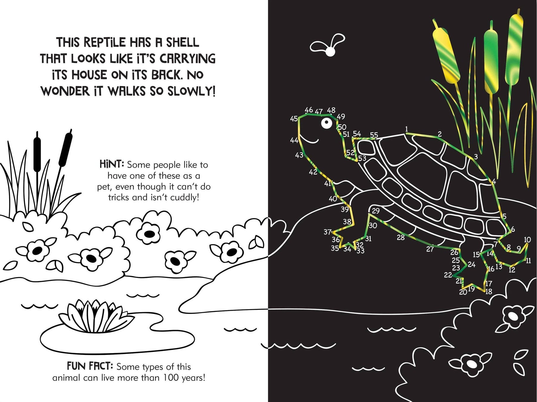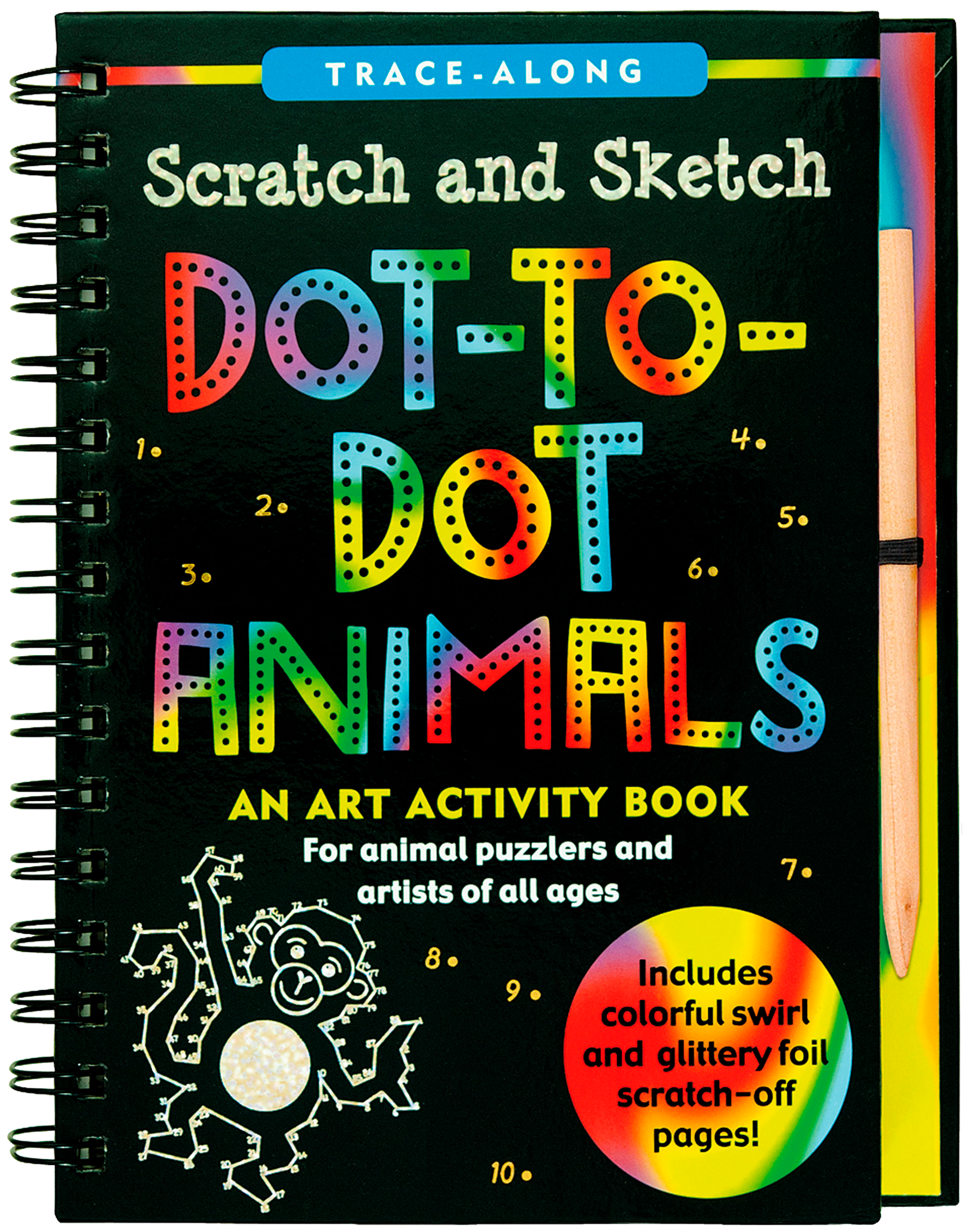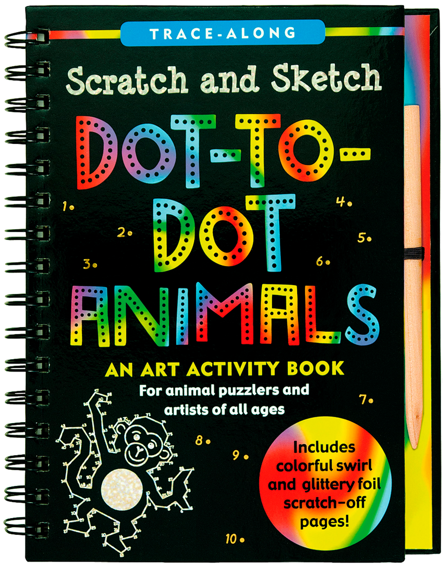 What creatures lie within these black scratch-off pages? Use your excellent Scratch and Sketch abilities to discover each hidden picture! Use the stylus included to connect the dots on each scratch-off page to create images of animals in brilliant foils and colors. Then add patterns and doodles to create a picture that's all your own! This is a Trace-Along Scratch and Sketch! White outlines on black scratch-off pages create a fun way for younger children (5 and up) to trace the pictures, revealing patterns, swirls, and holographic colors. They can also use the sketch pages in the back to draw their own animal pictures. The wooden stylus for tracing is shrink-wrapped with the book. Includes 20 black-coated scratch-off pages, 20 illustrated pages with fun text, and 20 extra pages for independent drawing and sketching. Suggested ages: 5 and up. Sturdy wire-o hardcover