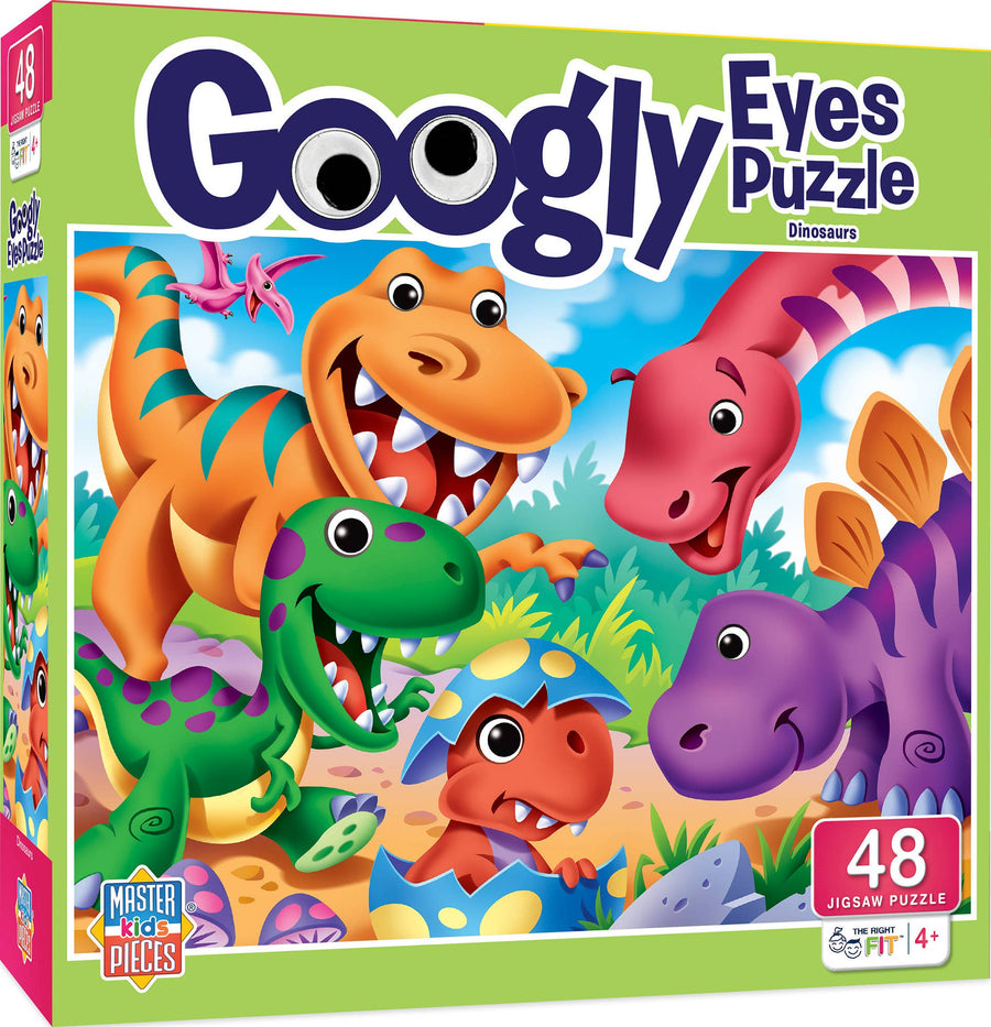 This Googly Eyes Dinosaurs puzzle is a great way to have even more fun with puzzles! Each puzzle comes with 8 pre-mounted, factory-secured wiggly and googly eyes, kids are sure to be entertained for hours! This puzzle is 48 pieces and 19 inches x 14 inches in size. Look for The Right Fit® puzzles collection and make sure your little one gets the correct piece count and size for a good challenge for their age. This puzzle is the right fit for ages 4+.
