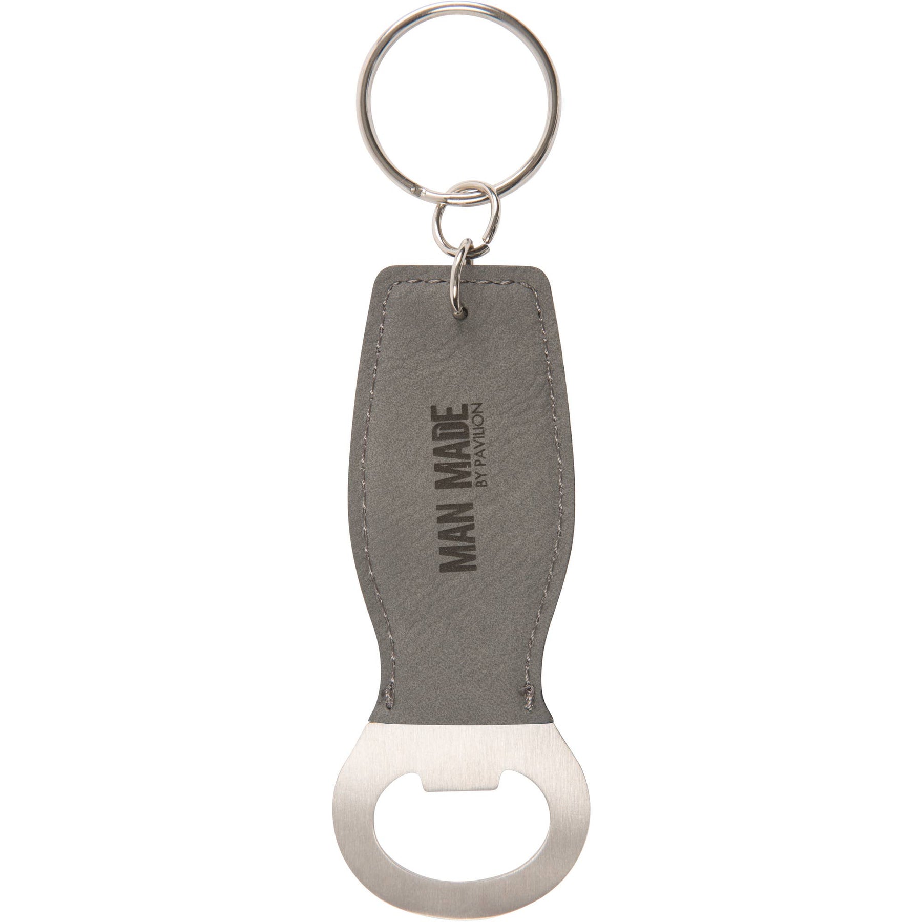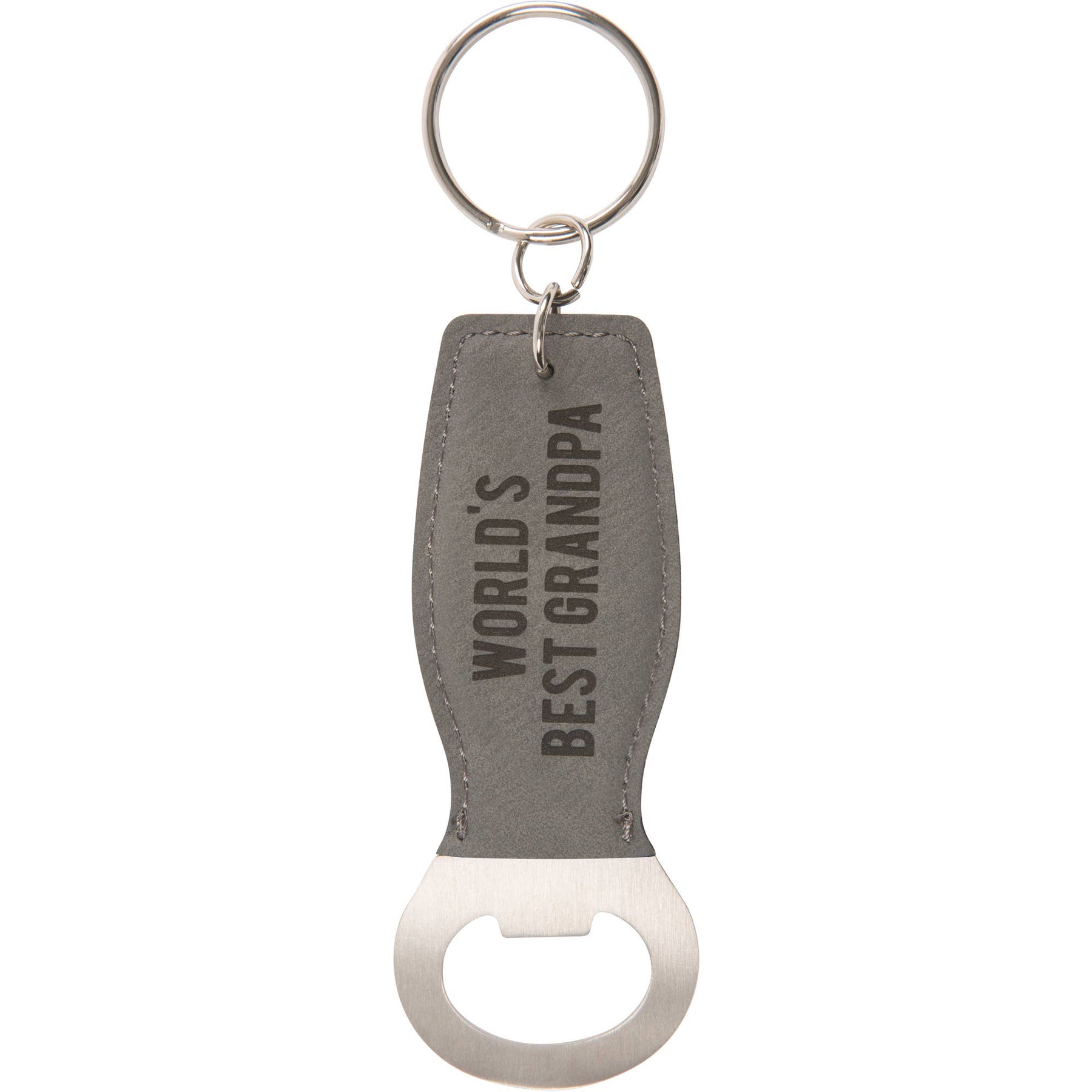 Bottle opener with attached keyring, packaged in a plastic polybag with a cardboard sleeve, is made from vegan leather and stainless steel, and features hand-stitching. "World's Best Grandpa" text is laser-printed onto the front of the bottle opener. Wipe clean with a damp cloth. Great for gifting to a grandpa who loves beer.