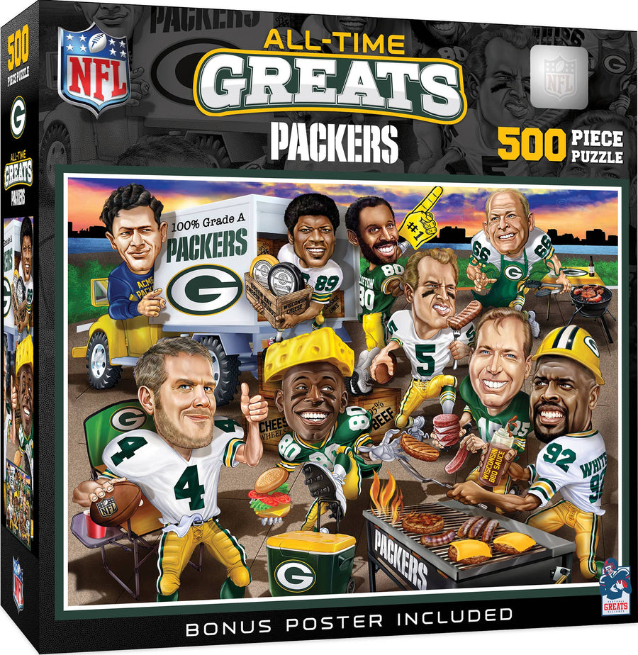 This MasterPieces 500pc NFL puzzle measures 15” x 21” and features some of the greatest NFL players to ever wear a Green Bay Packers uniform. The easily recognizable and fun caricatures are shown in an setting specific to the team name, city or history. To reduce its impact on our environment, the chipboard used in this puzzle is made of recycled material.