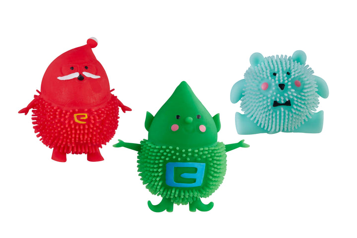 Bring tiny friends and good cheer to the holiday party with our Holiday Squishy Critters! Silly slime-filled squishy critters come in 3 assorted holiday-themed styles - a jolly red Santa, a friendly green elf, and a cute blue bear. Rubbery nubbins provide a satisfying sensory experience when squeezing the toys. Display case contains 24 squishies.