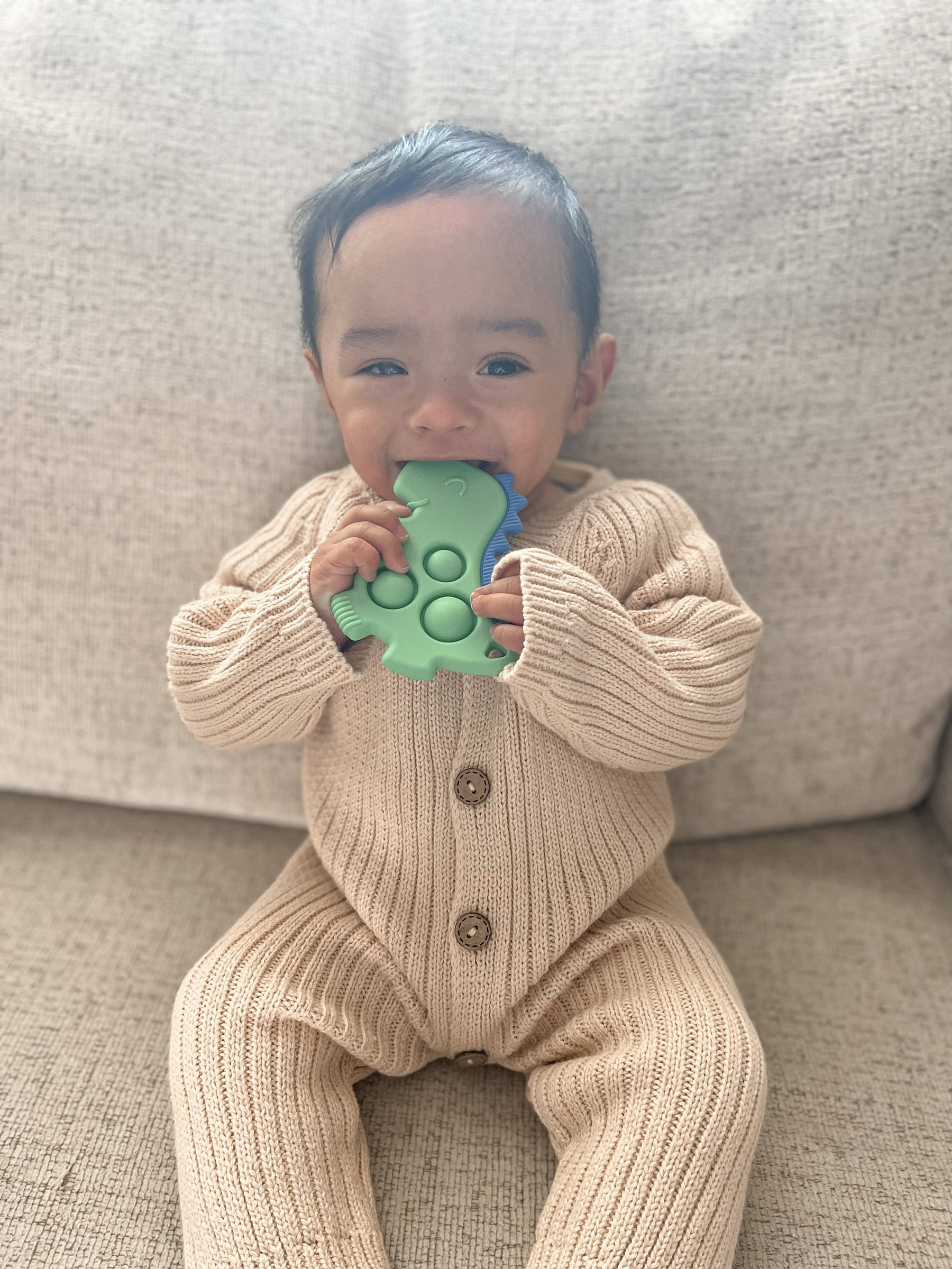 Chew on this! A pop of personality: a teething bestie & sensory toy all-in-one! Our Itzy Pop™ engages baby with popping sounds & movement while the raised textures gently soothe sore gums. Pop it in your bag or clip it for easy, fun, and safe relief while on-the-go. - BPA-free and PVC-free - 100% food grade silicone - Ages 3m+