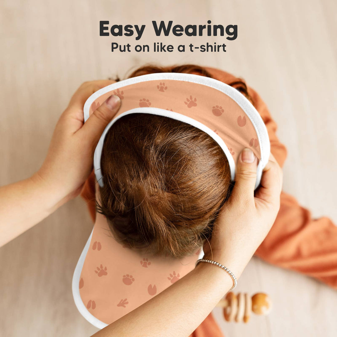 The unique pull-on lap shoulder design of the Hallo Baby Teething Bib makes it easy to wear. Just slip it over the baby's head like a t-shirt and you are all set. It stays on all day, even for the most active toddler.