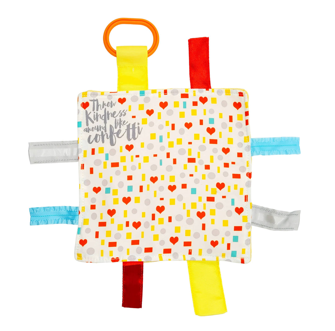 Millennial Moms adore this product as it promotes KINDNESS, which is something we all need in our lives! A 8x8 sensory square tag toy that will keep baby busy and entertained for tummy time, in the stroller or gazing above in their crib. Sensory visual stimulation from the bright, modern colors + learning prints with hidden shapes. Tactile play with the variety of ribbon tags and comfort received from the soft textured minky dot. Babies also love the crackling crinkle baby paper too! Comes with a toy link to attach to car seat, stroller and for best retail display.