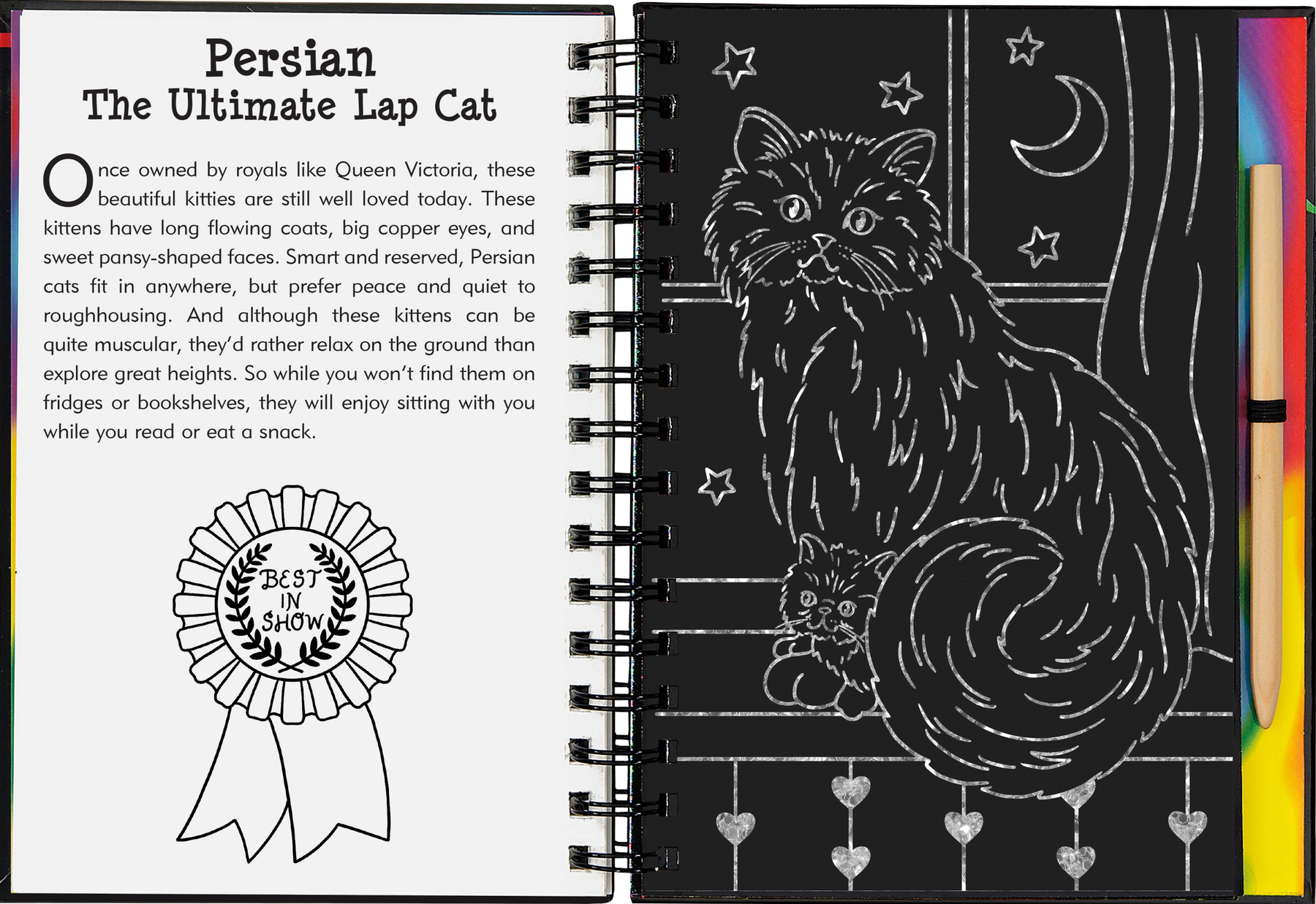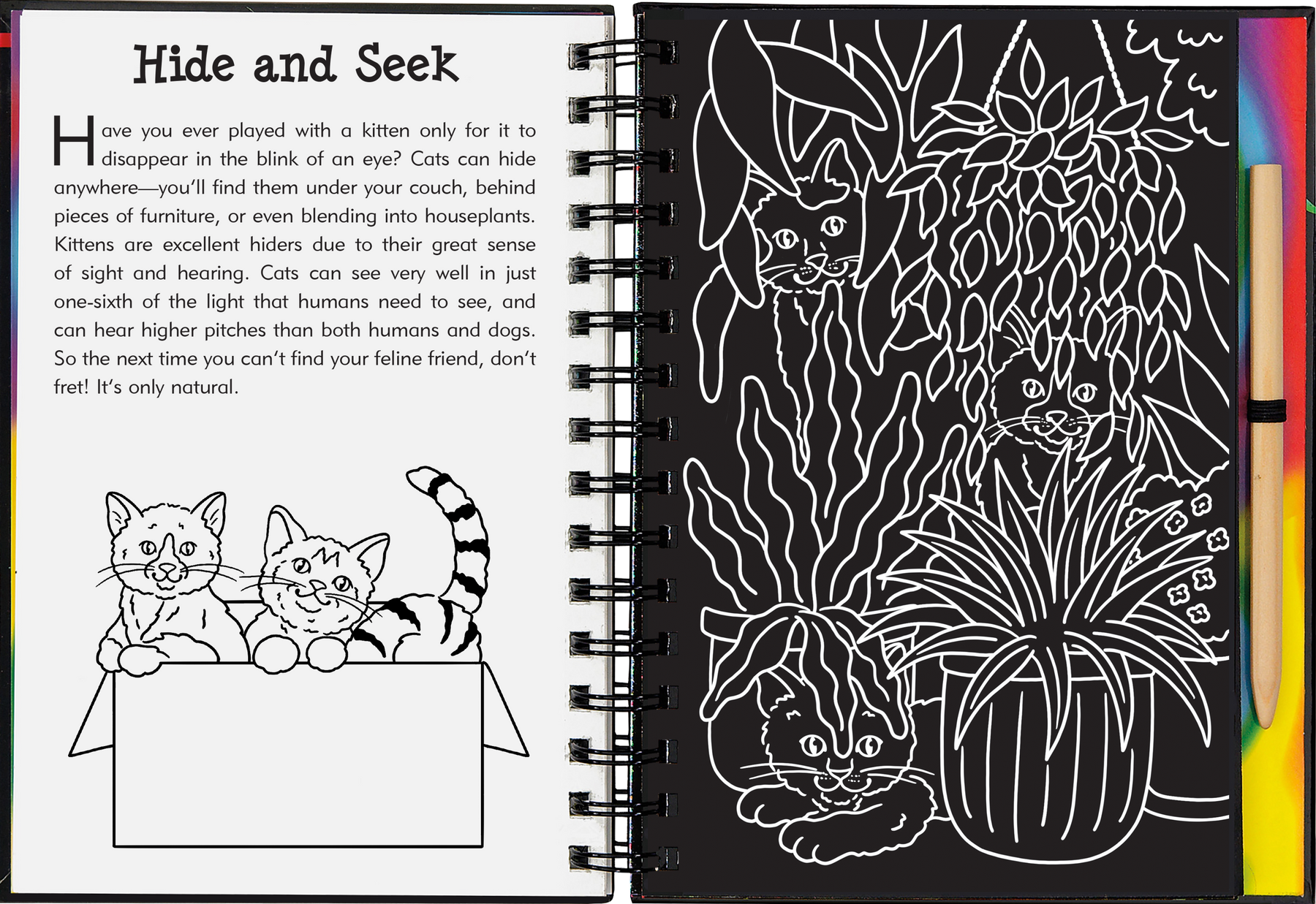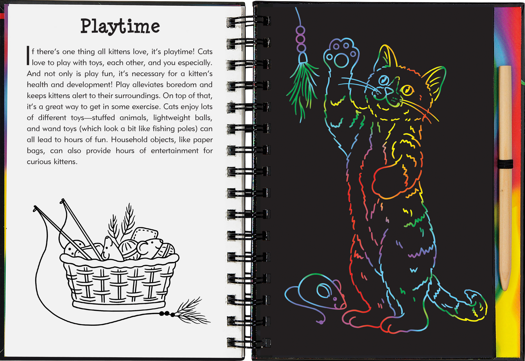 Scratch and Sketch your way through the cuddly world of kittens! This is a Trace-Along Scratch and Sketch ! Use the wooden stylus included to trace the white outlines on the black-coated pages and reveal the glittery foil and colorful swirl patterns beneath! Trace the white lines to reveal different kinds of kittens in action in glittering foil and colorful swirls. Makes a fun way for young children (5 and up) to build confidence in their creativity. They can also use the extra sketch pages in the back to draw their own pictures. Art activity book contains 20 black-coated scratch-off pages, 20 illustrated pages with informative text, and 20 extra pages for independent drawing and sketching. Learn all about these furry friends! Learn which cat breed loves to swim, why cats are such good hiders, how kittens talk with their tails, and more! The wooden stylus is shrink-wrapped with the book. Suggested ages: