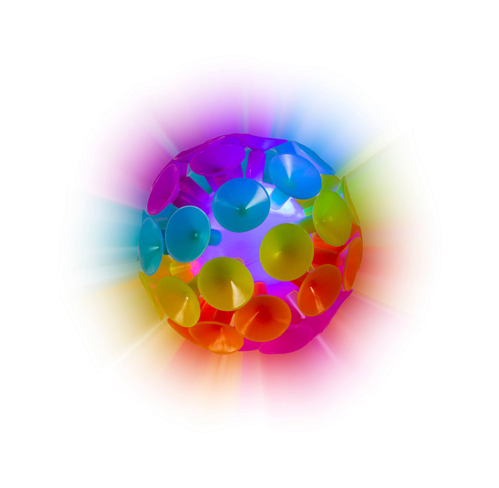 This jumbo light-up suction cup ball from Toysmith is a popular party favor and classroom reward prize. With bright rainbow coloring and mini suction cups all around the exterior, this sticky ball is made of nontoxic plastic that’s sized for easy handling and suitable for indoor or outdoor play. Simply throw it or bounce it on a flat surface and watch as the suction cups adhere. Ball flashes when bounced, lighting up the pink, orange, yellow, and blue suction cups. Balls come with colorful display case for easy holding and showcasing. Nonreplaceable batteries included.
