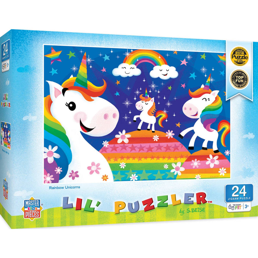 Lil' Puzzlers puzzle of Rainbow Unicorns is the perfect starter puzzle for kids. Rainbow Unicorns features a unicorn family in their rainbow world! This puzzle is 24 pieces and 19 inches x 14 inches in size. Look for The Right Fit® puzzles collection and make sure your little one gets the correct piece count and size for a good challenge for their age. This puzzle is the right fit for ages 3+.