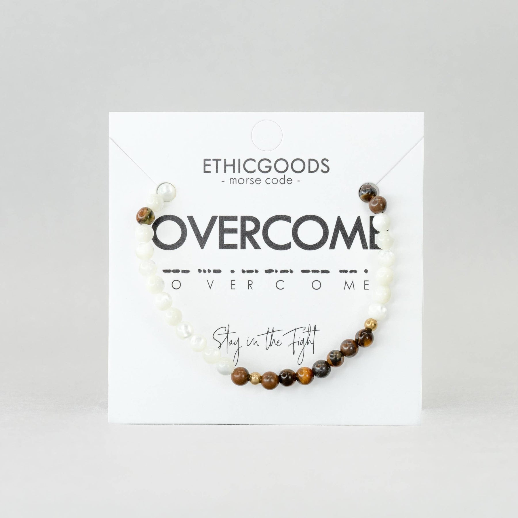 OVERCOME Stay in the fight. This bracelet spells OVERCOME in Morse Code in our classic 4mm beads! We all face obstacles in our lives. This bracelet is a perfect reminder to keep fighting, you can and will overcome! We’d love to hear what your jewelry means to you. Share your story and photos with us! @ethicgoods How to read your jewelry: A Morse Code dot is one bead and a dash is two beads in the alternating color. Start at the small gold spacer bead and follow the Morse Code spelling around the bracelet! Details * Length - 7.75" | Stretches to 8.5" * Handmade in Thailand by women who are survivors of human trafficking * Made with semi-precious stones, glass beads, elastic, and love.  * Decode it: a dot is one bead, a dash is two beads!